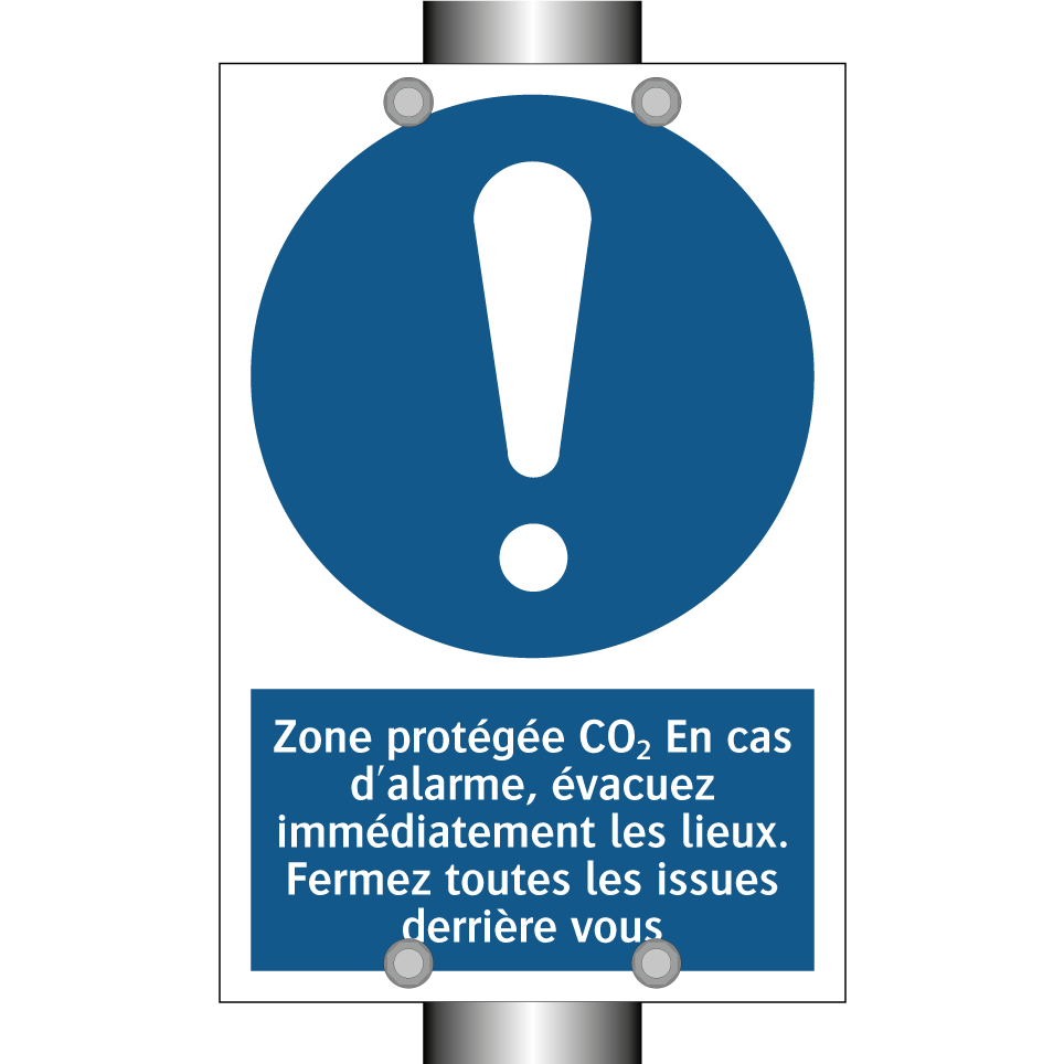Panneau d'obligation avec le texte : "Zone protégée CO₂ En cas d'alarme, évacuez immédiatement les lieux. Fermez toutes les issues derrière vous."