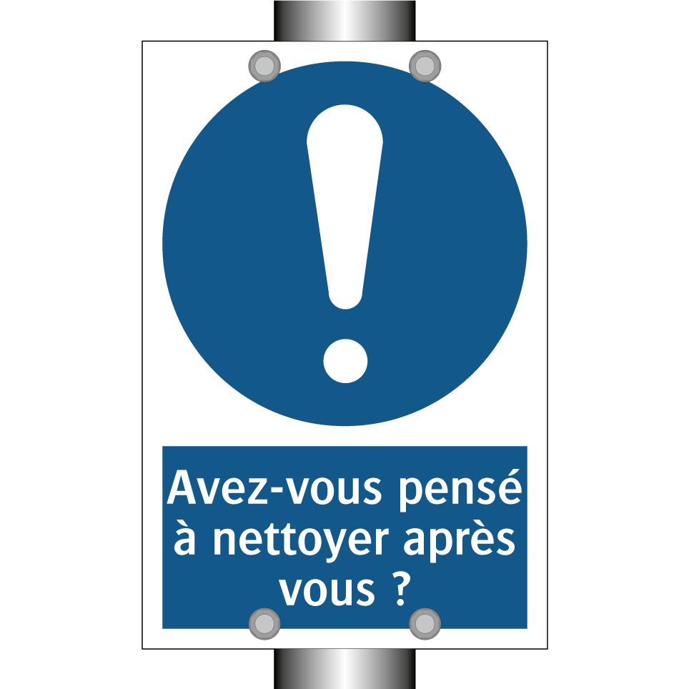 Panneau d'obligation avec le texte : "Avez-vous pensé à nettoyer après vous ?"