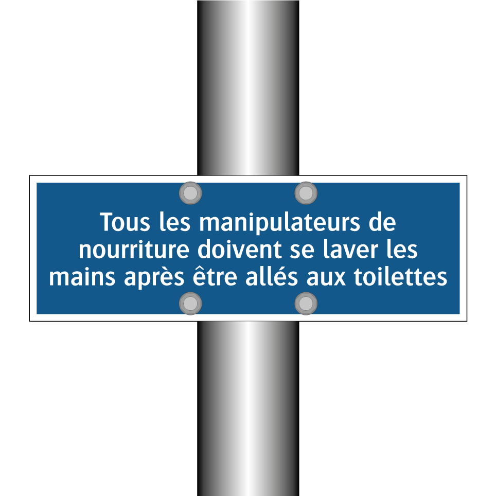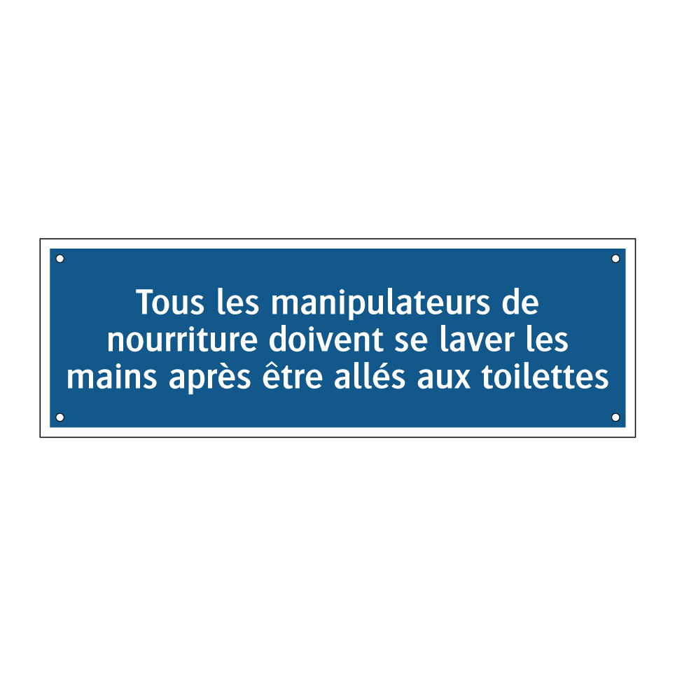 Ce panneau d'obligation est essentiel pour garantir l'hygiène dans les environnements où la manipulation des aliments est courante. Idéal pour les cuisines professionnelles, les restaurants, les cantines et autres lieux de restauration, il rappelle aux employés l'importance de se laver les mains après avoir utilisé les toilettes. En plaçant ce panneau bien en vue près des lavabos ou à l'entrée des zones de préparation alimentaire, vous assurez le respect des normes sanitaires et protégez la santé de vos clients. Ce panneau bleu avec texte blanc est un rappel visuel efficace pour maintenir un environnement propre et sûr.