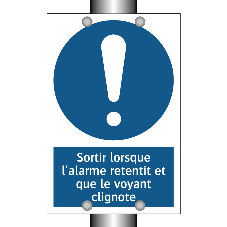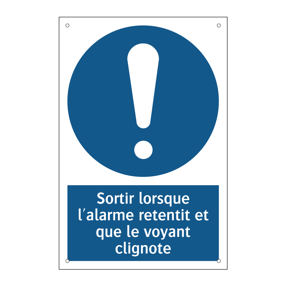 Panneau d'obligation avec le texte : "Sortir lorsque l'alarme retentit et que le voyant clignote"
