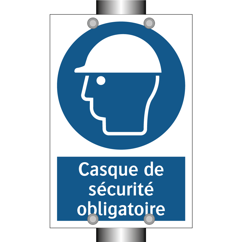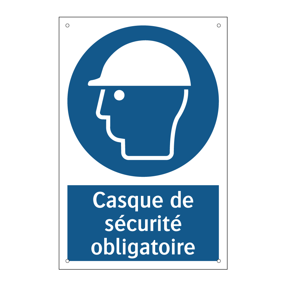 Panneau d'obligation avec le texte : "Casque de sécurité obligatoire"