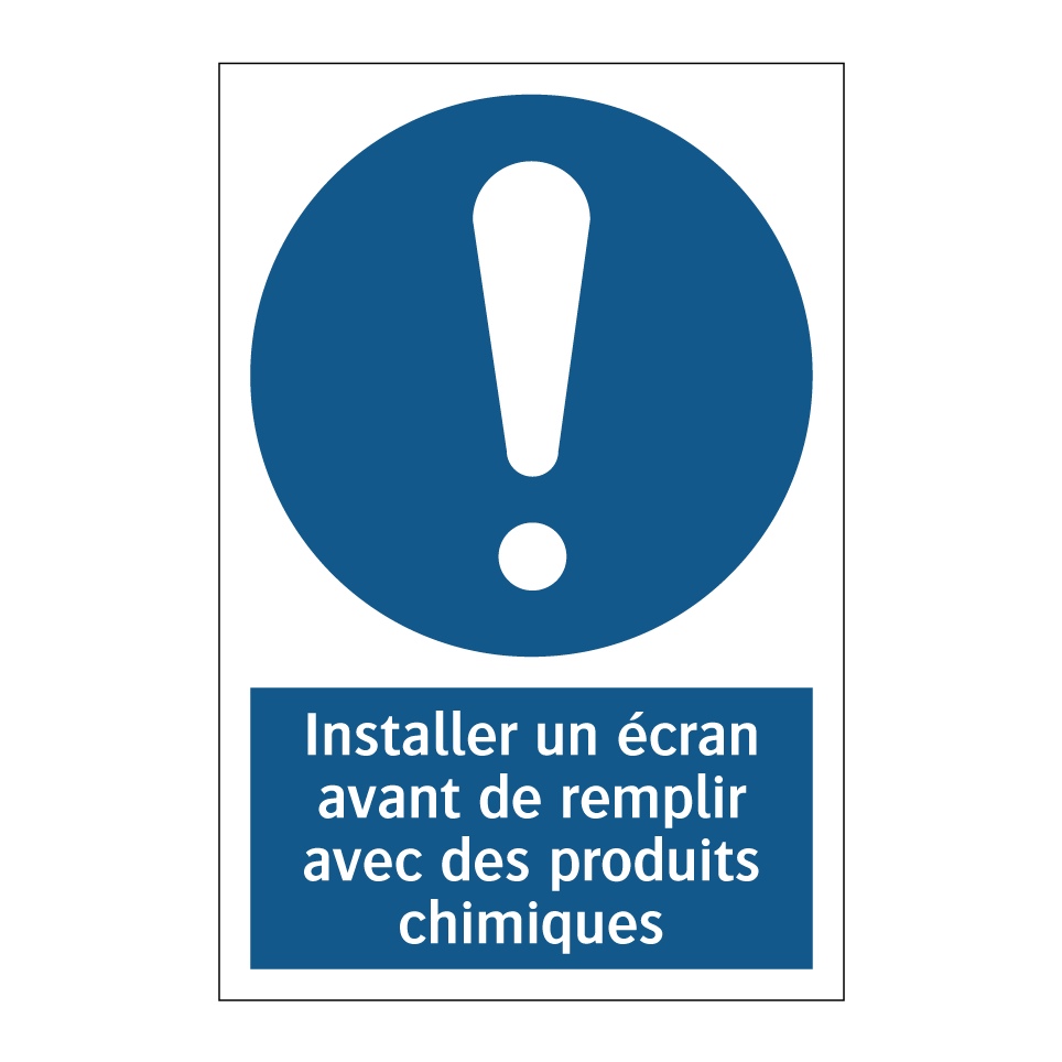 Panneau d'obligation avec le texte : "Installer un écran avant de remplir avec des produits chimiques"