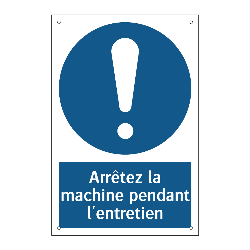 Panneau d'obligation avec le texte : "Arrêtez la machine pendant l'entretien"