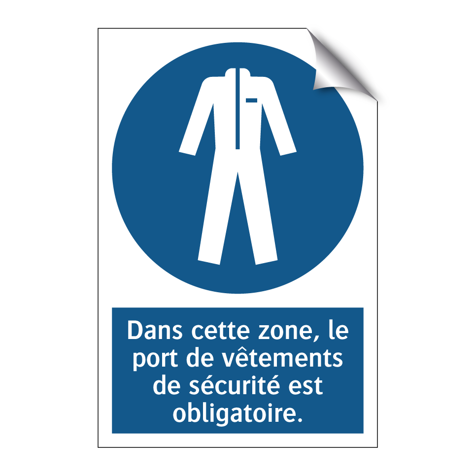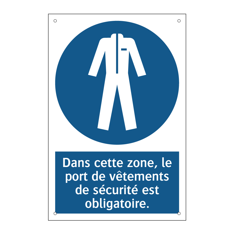 Panneau d'obligation avec le texte : "Dans cette zone, le port de vêtements de sécurité est obligatoire."