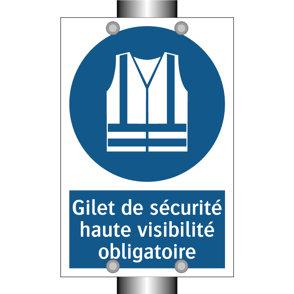 Panneau d'obligation avec le texte : "Gilet de sécurité haute visibilité obligatoire"