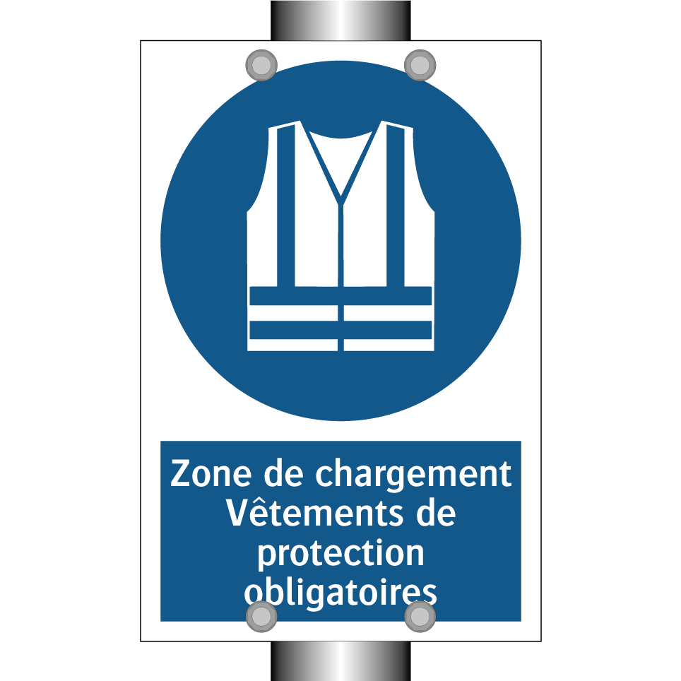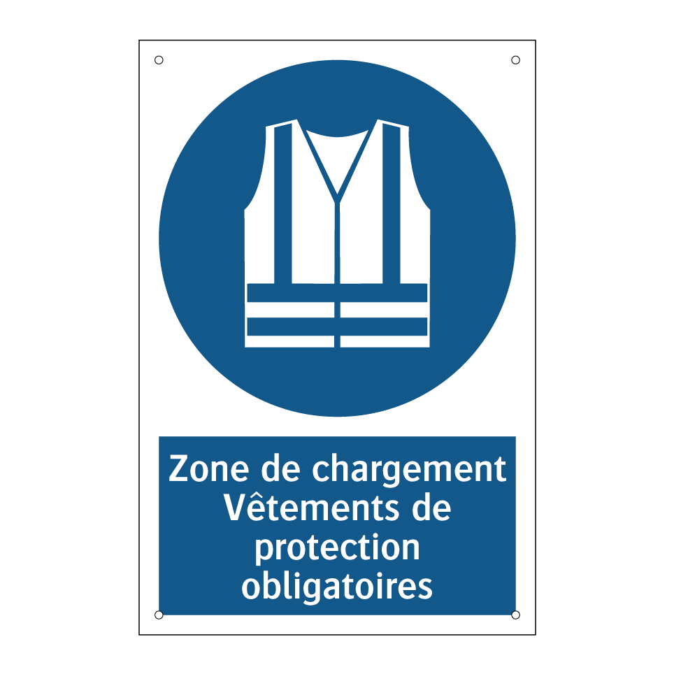 Panneau d'obligation avec le texte : "Zone de chargement Vêtements de protection obligatoires"