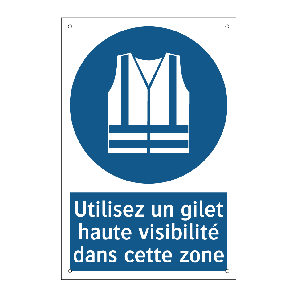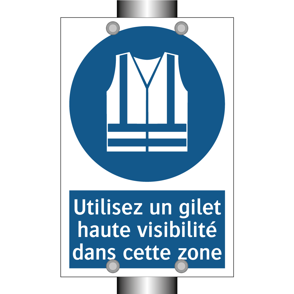 Panneau d'obligation avec le texte : "Utilisez un gilet haute visibilité dans cette zone"