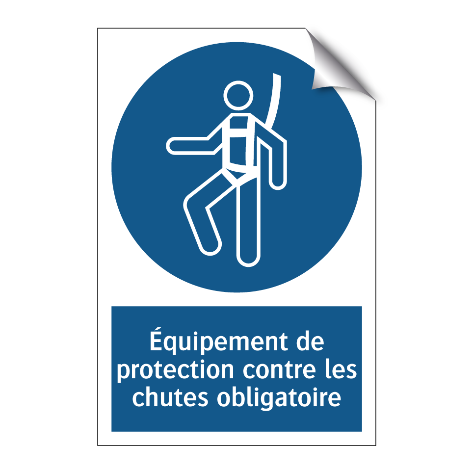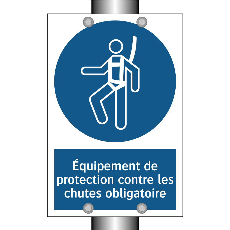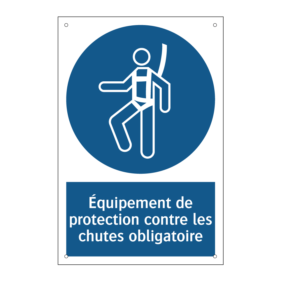 Panneau d'obligation avec le texte : "Équipement de protection contre les chutes obligatoire"
