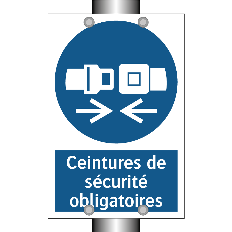 Panneau d'obligation avec le texte : "Ceintures de sécurité obligatoires"