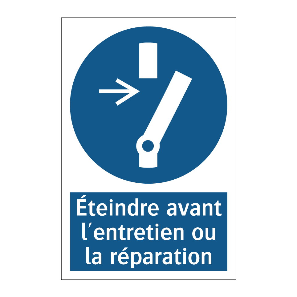 Panneau d'obligation avec le texte : "Éteindre avant l'entretien ou la réparation"