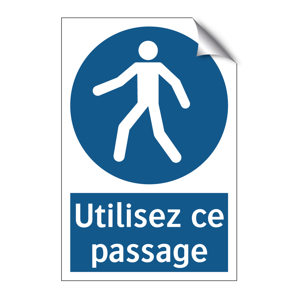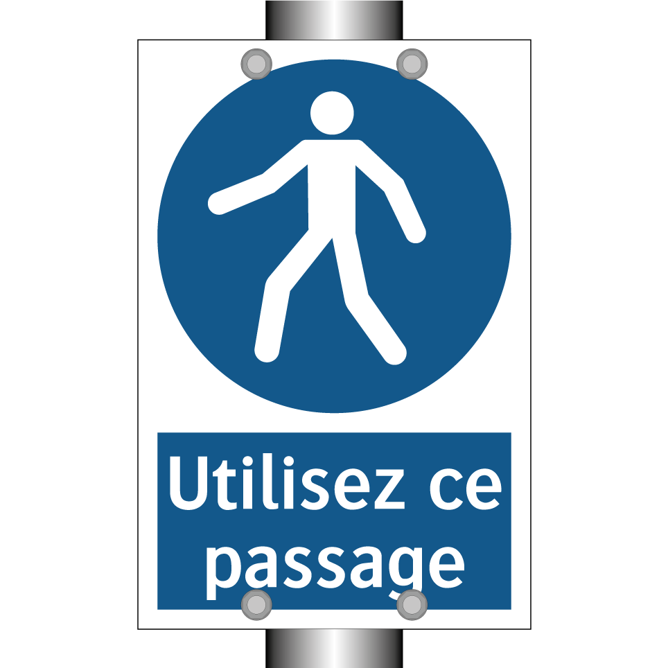 Ce panneau d'obligation est essentiel pour guider les piétons vers le passage approprié. Idéal pour les zones à fort trafic, il assure une circulation fluide et sécurisée. Ce type de signalisation est particulièrement utile dans les centres commerciaux, les gares, et les aéroports, où l'orientation est cruciale. En installant ce panneau, vous facilitez le déplacement des personnes et réduisez les risques d'accidents. Sa couleur bleue et son texte blanc attirent l'attention, garantissant que le message est bien compris. Placez-le à des endroits stratégiques pour maximiser son efficacité et améliorer l'expérience des usagers.