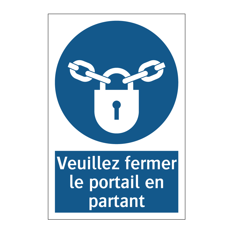 Panneau d'obligation avec le texte : "Veuillez fermer le portail en partant"