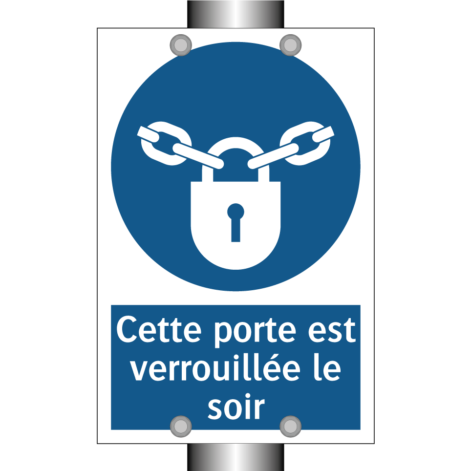 Panneau d'obligation avec le texte : "Cette porte est verrouillée le soir"