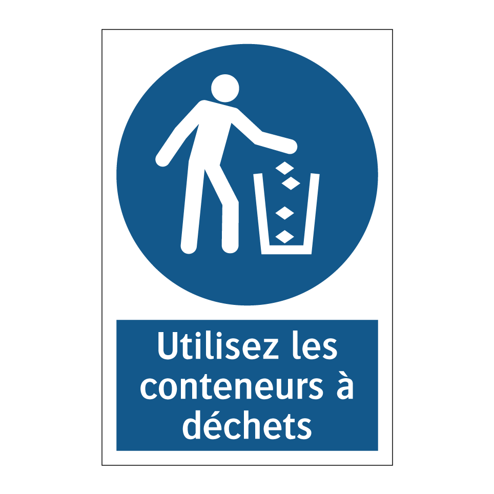 Panneau d'obligation avec le texte : "Utilisez les conteneurs à déchets"