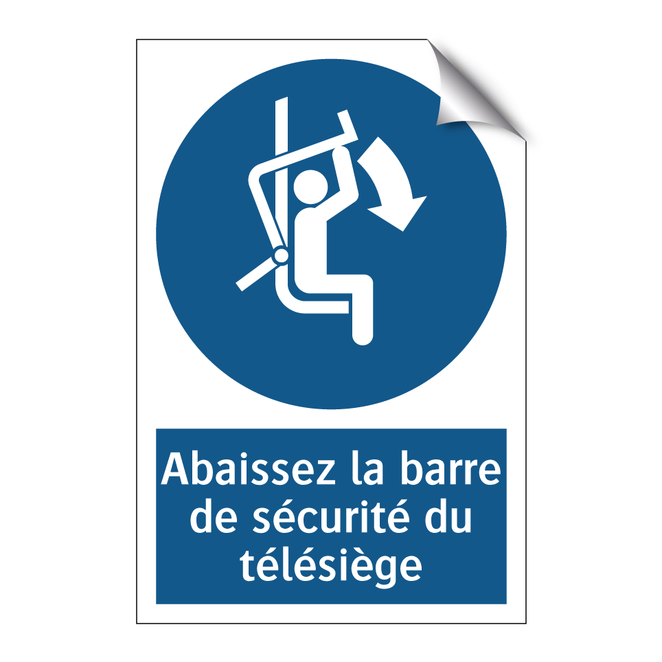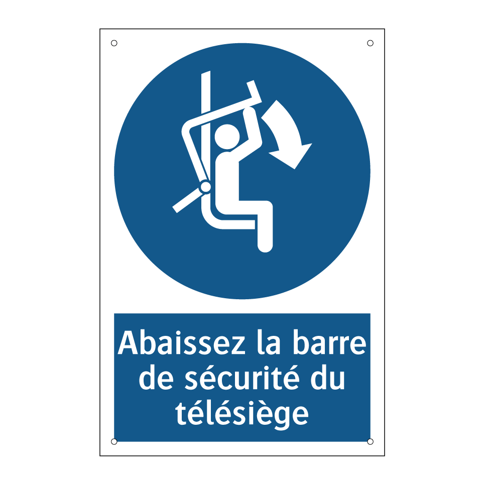 Panneau d'obligation avec le texte : "Abaissez la barre de sécurité du télésiège"
