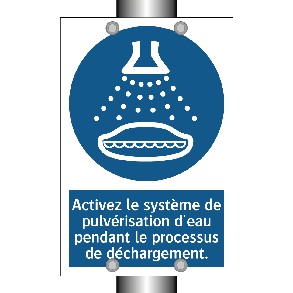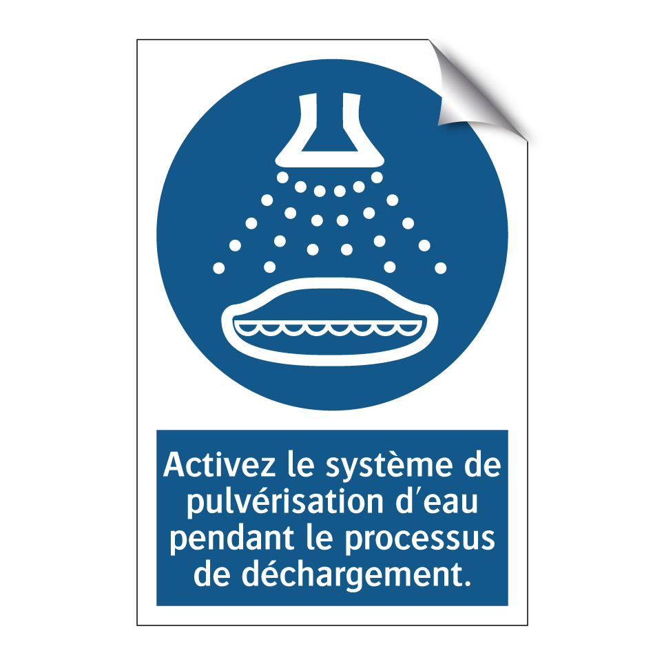 Panneau d'obligation avec le texte : "Activez le système de pulvérisation d'eau pendant le processus de déchargement."