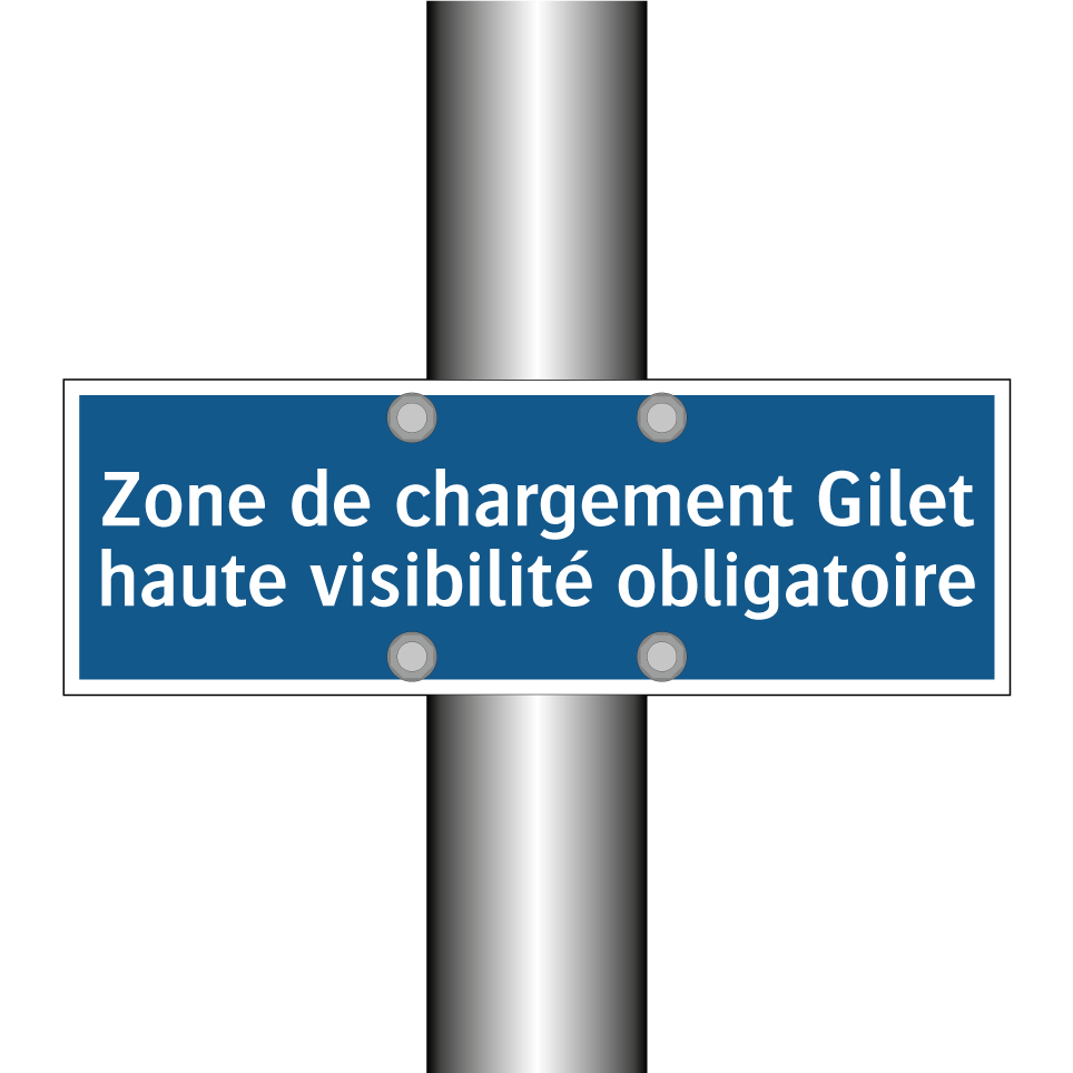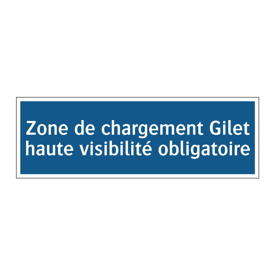 Panneau d'obligation avec le texte : "Zone de chargement Gilet haute visibilité obligatoire"