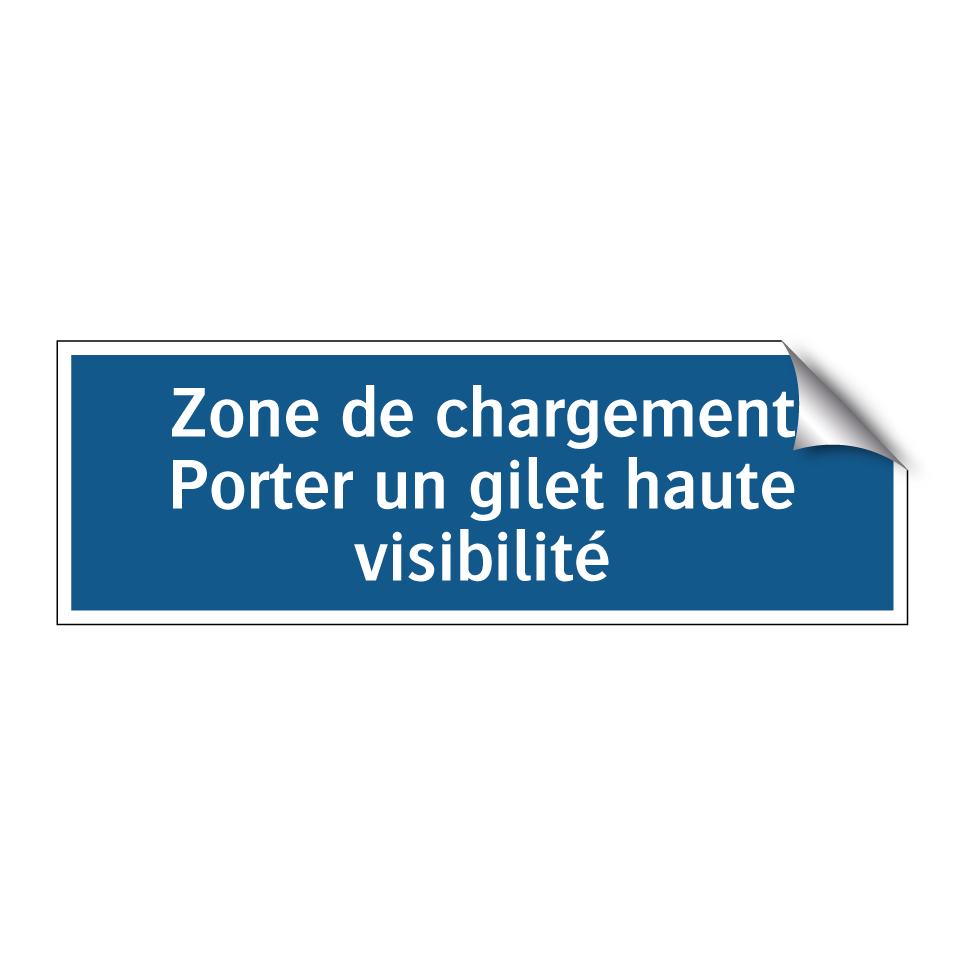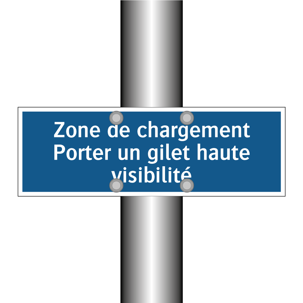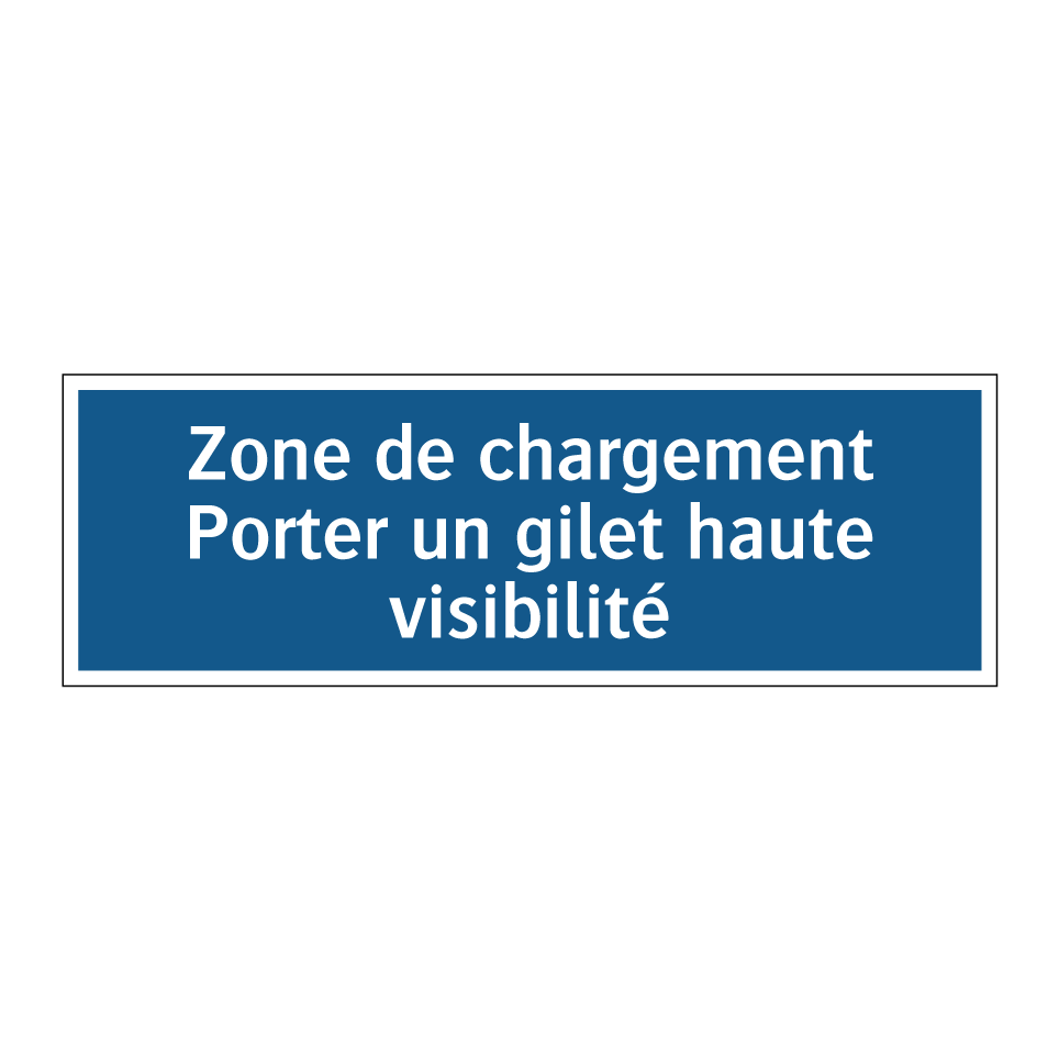 Panneau d'obligation avec le texte : "Zone de chargement Porter un gilet haute visibilité"