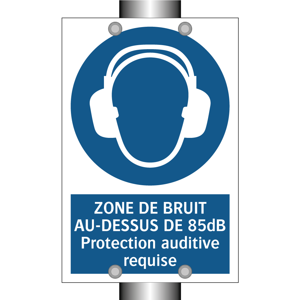 Panneau d'obligation avec le texte : "ZONE DE BRUIT AU-DESSUS DE 85dB Protection auditive requise"