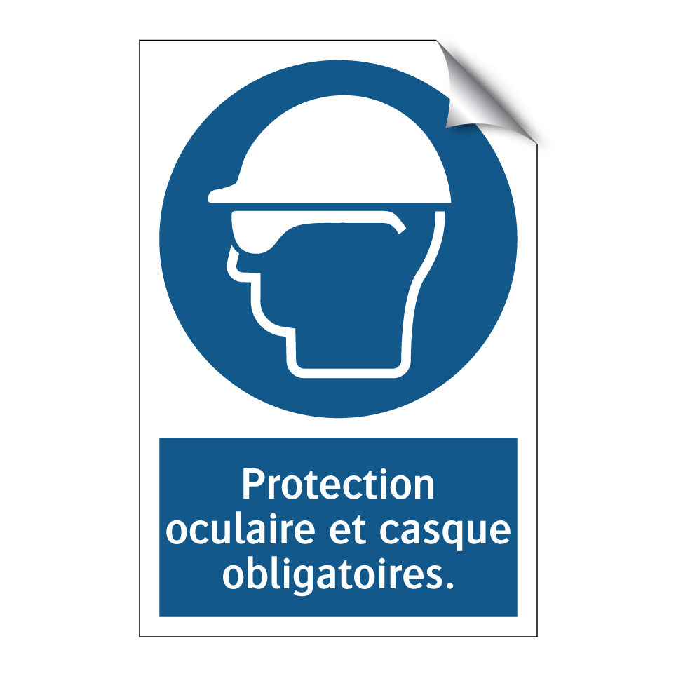 Panneau d'obligation avec le texte : "Protection oculaire et casque obligatoires."