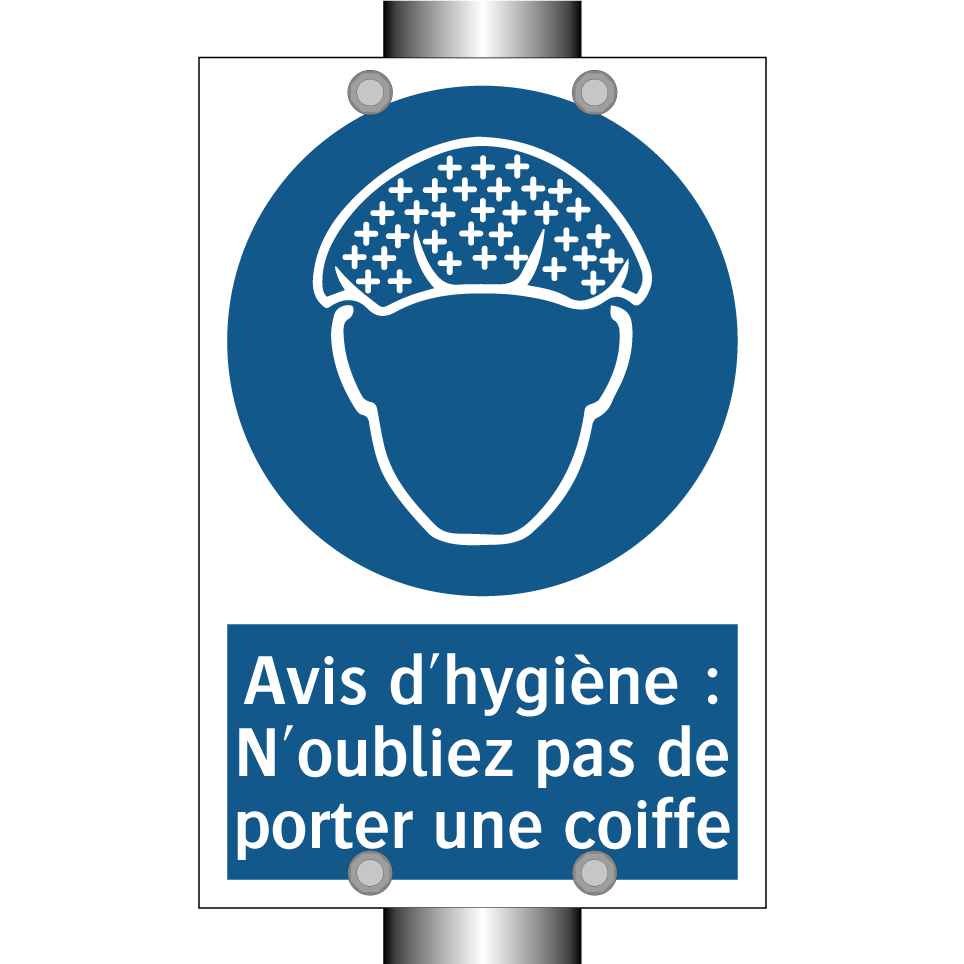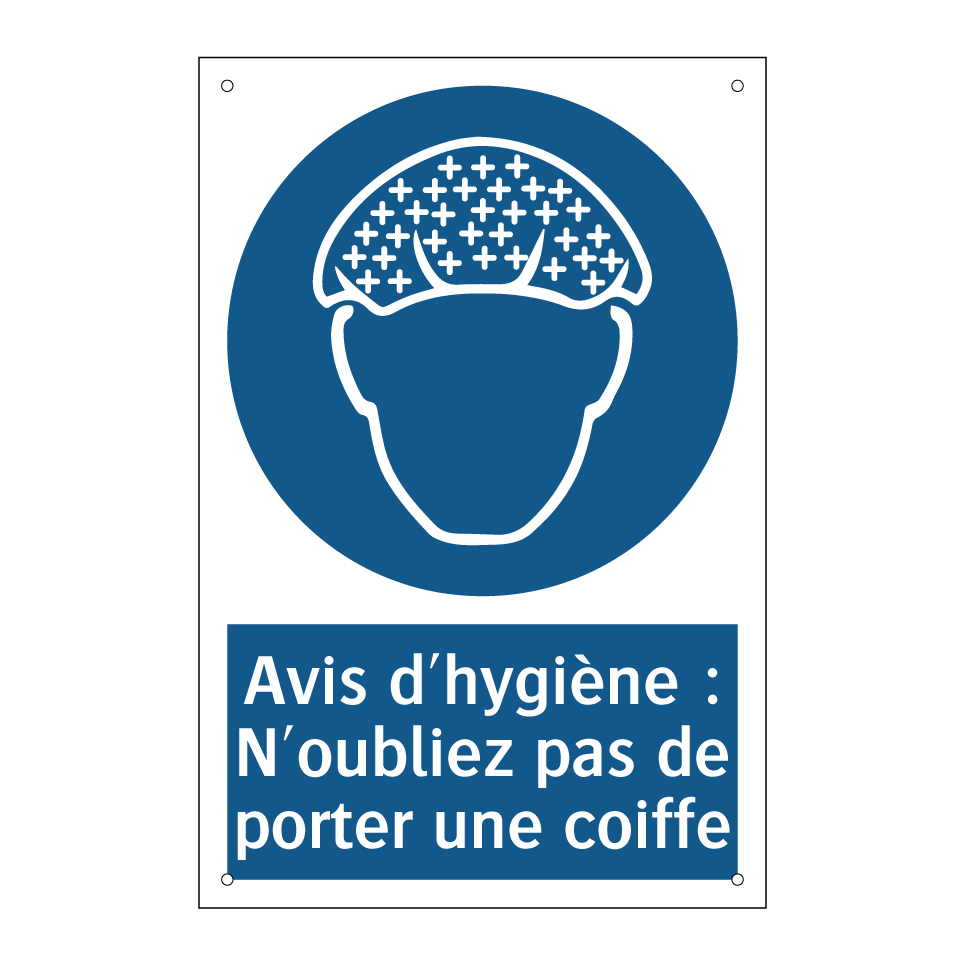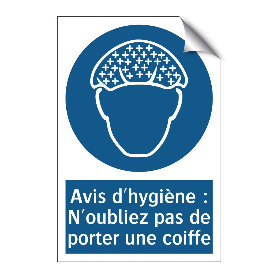 Panneau d'obligation avec le texte : "Avis d'hygiène : N'oubliez pas de porter une coiffe"