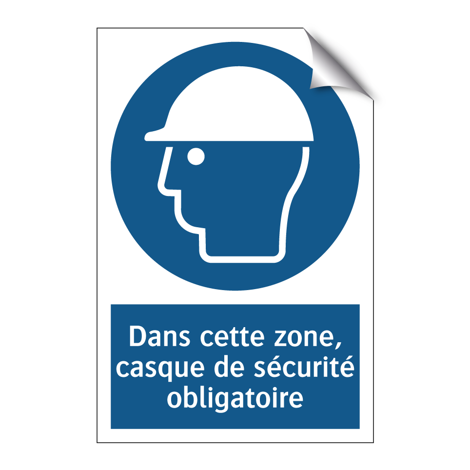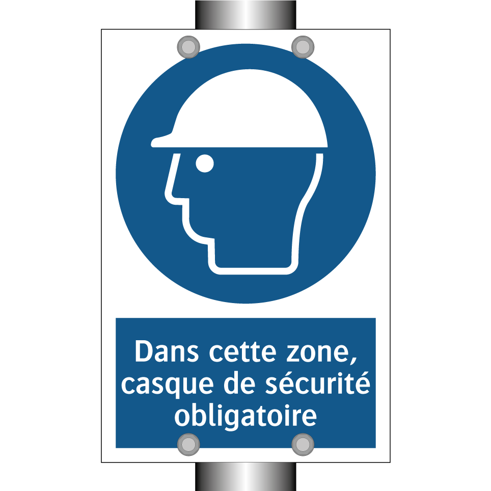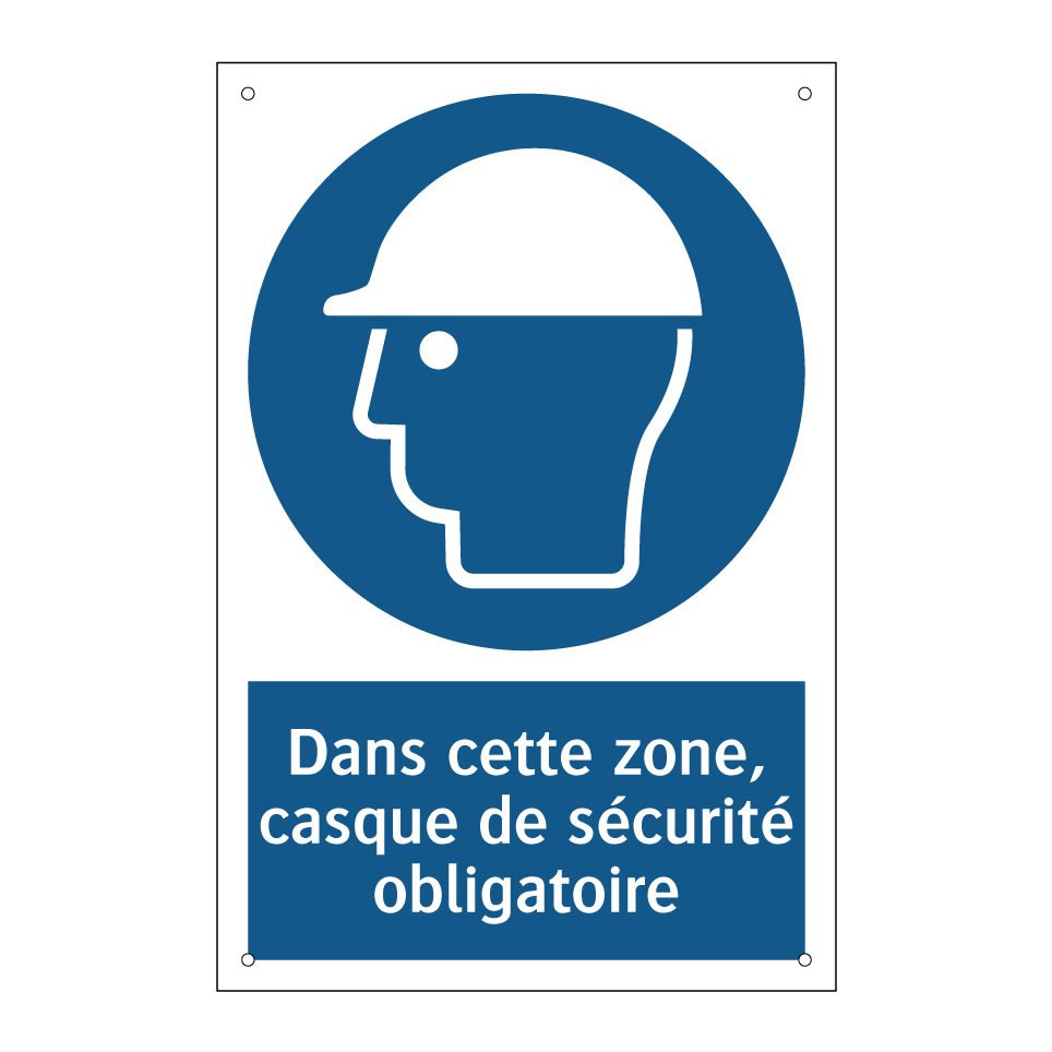 Panneau d'obligation avec le texte : "Dans cette zone, casque de sécurité obligatoire"