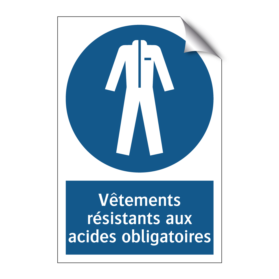 Panneau d'obligation avec le texte : "Vêtements résistants aux acides obligatoires"