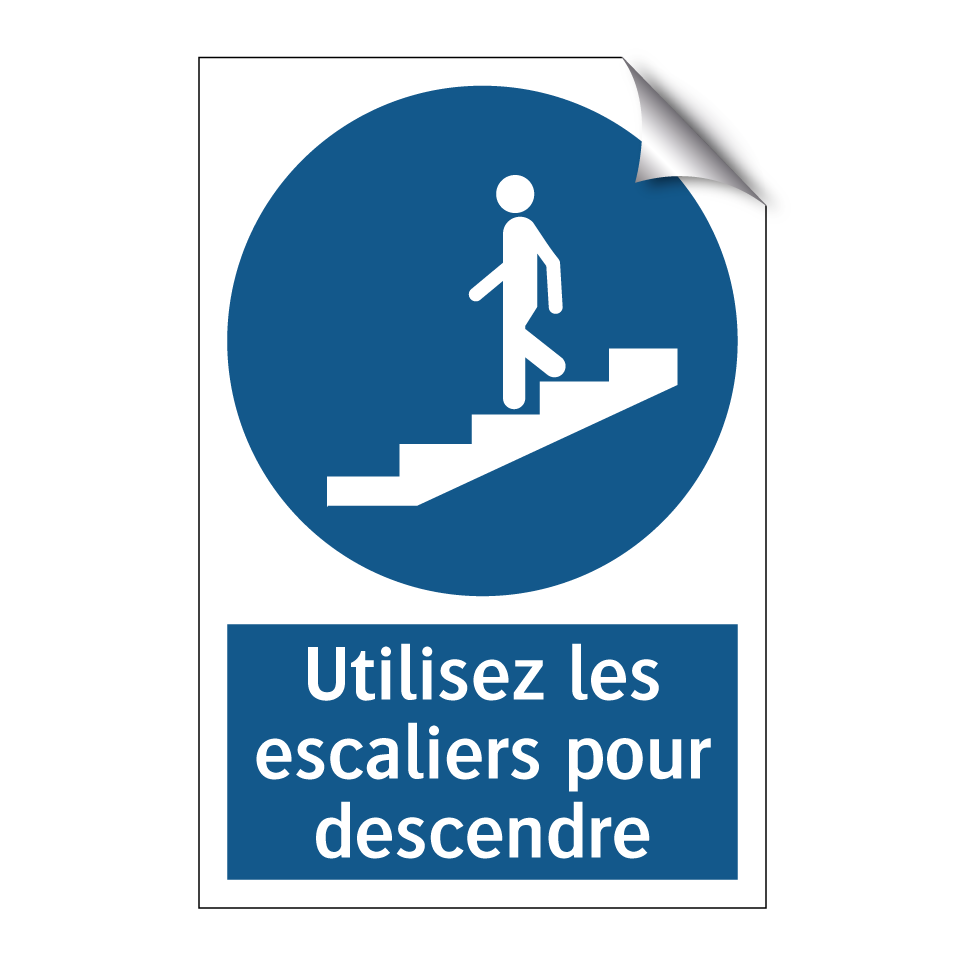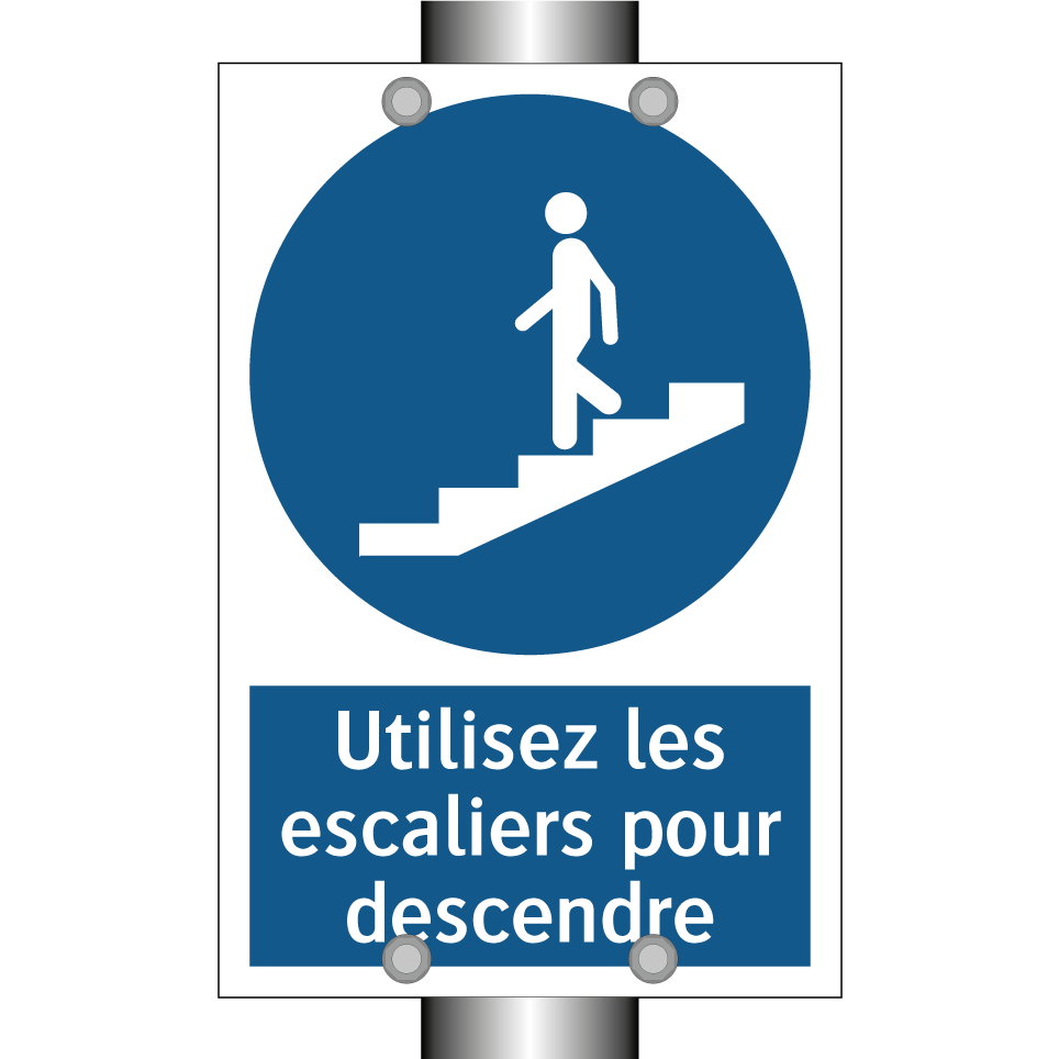 Panneau d'obligation avec le texte : "Utilisez les escaliers pour descendre"
