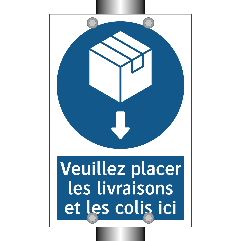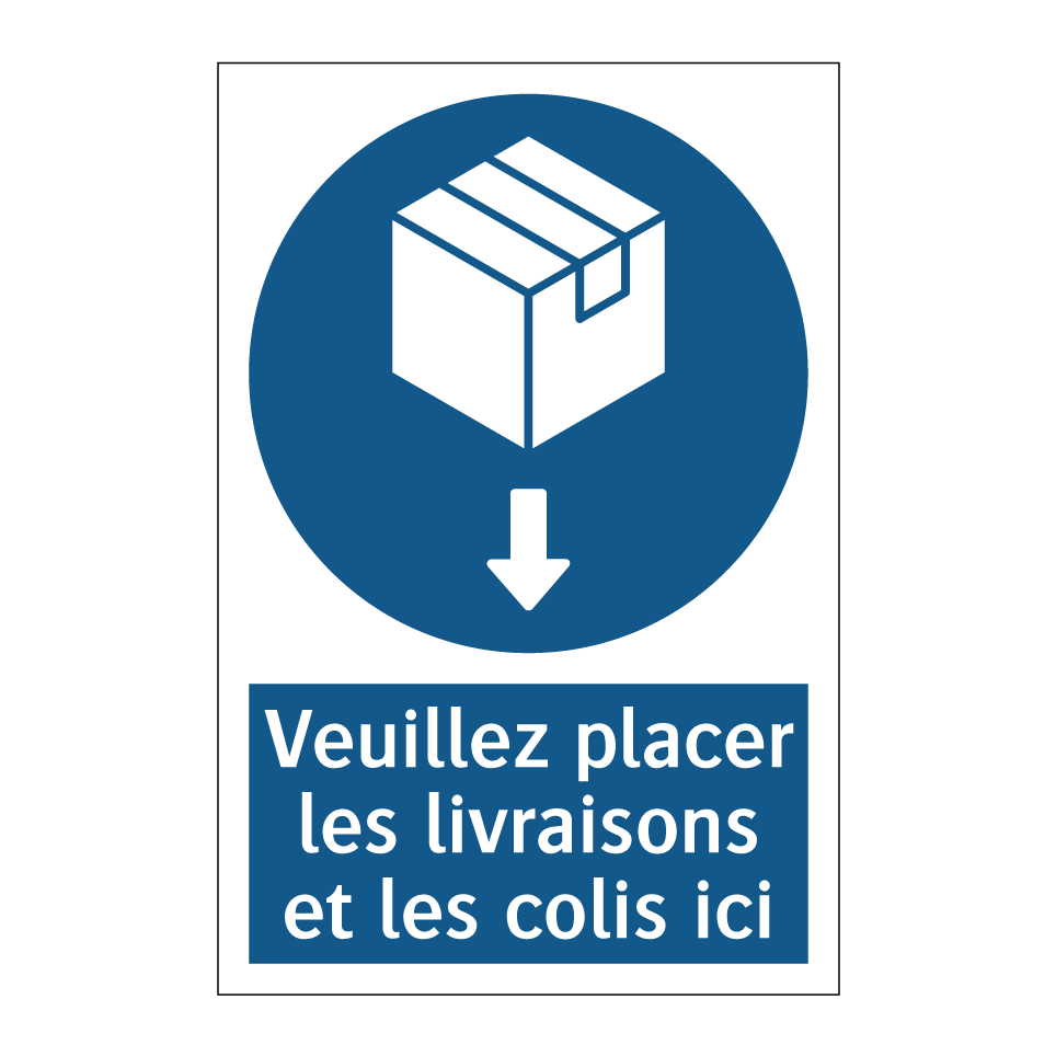 Panneau d'obligation avec le texte : "Veuillez placer les livraisons et les colis ici"