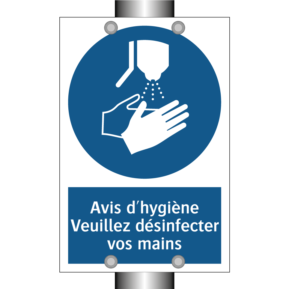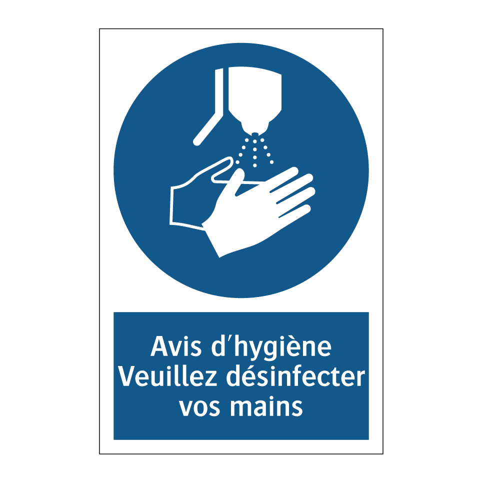 Panneau d'obligation avec le texte : "Avis d'hygiène Veuillez désinfecter vos mains"