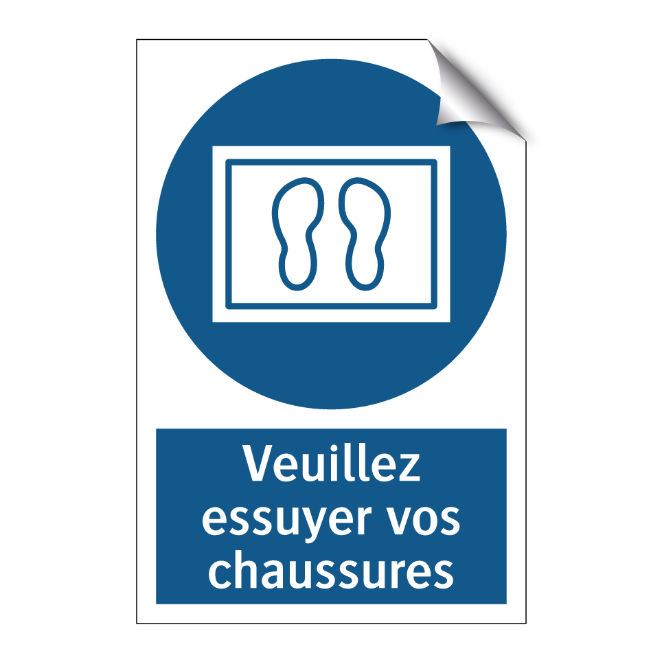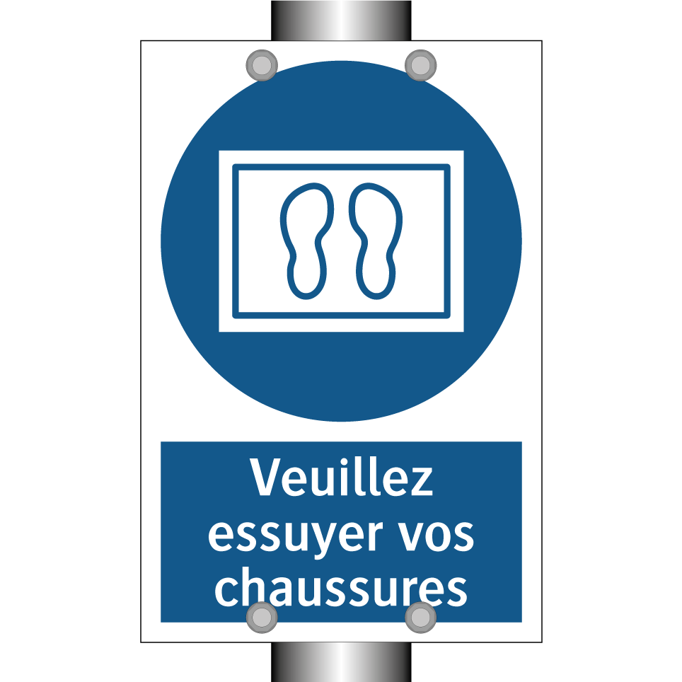 Panneau d'obligation avec le texte : "Veuillez essuyer vos chaussures"