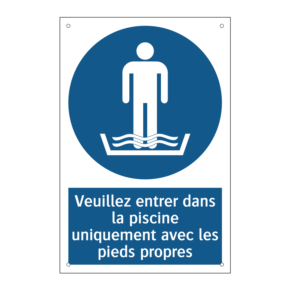 Panneau d'obligation avec le texte : "Veuillez entrer dans la piscine uniquement avec les pieds propres."