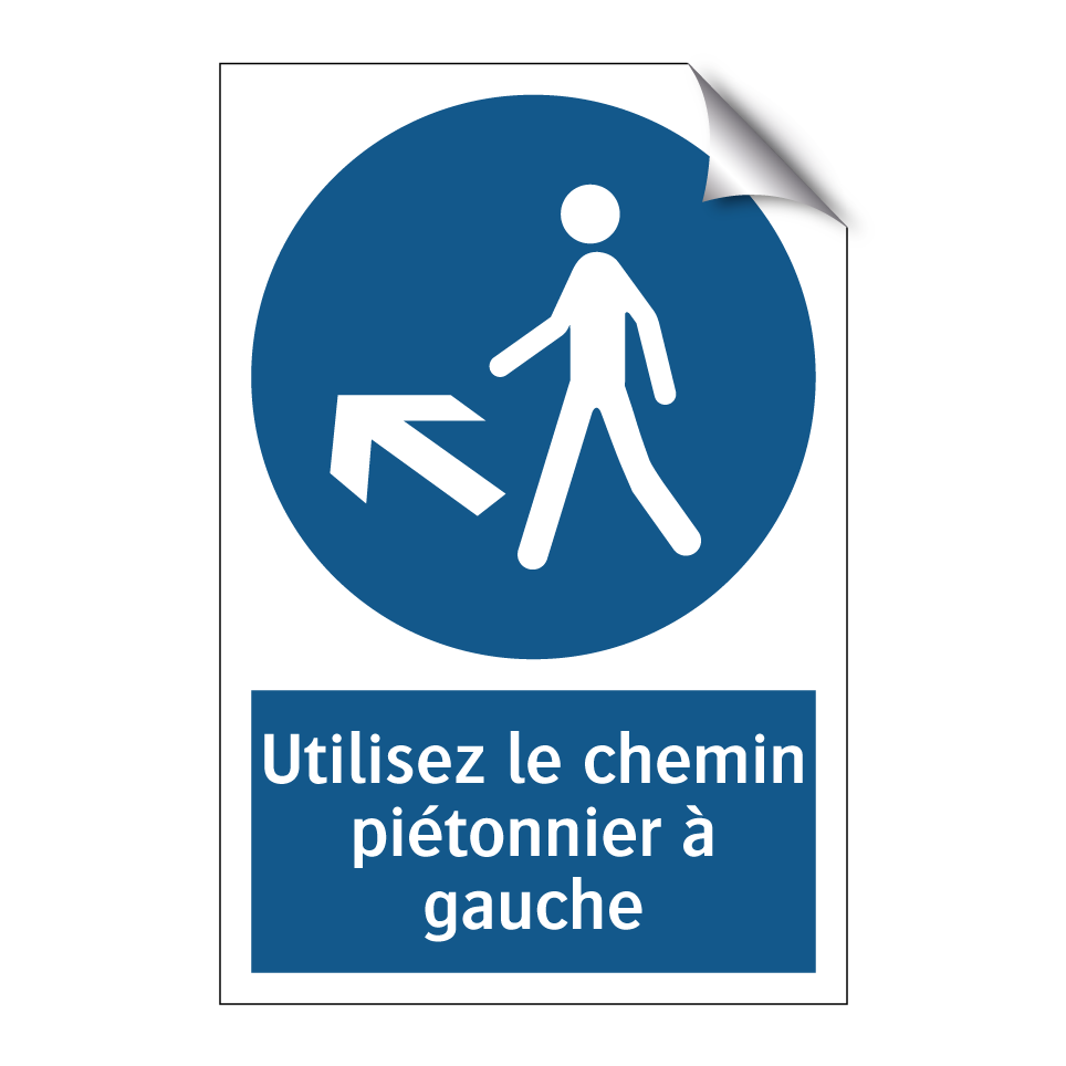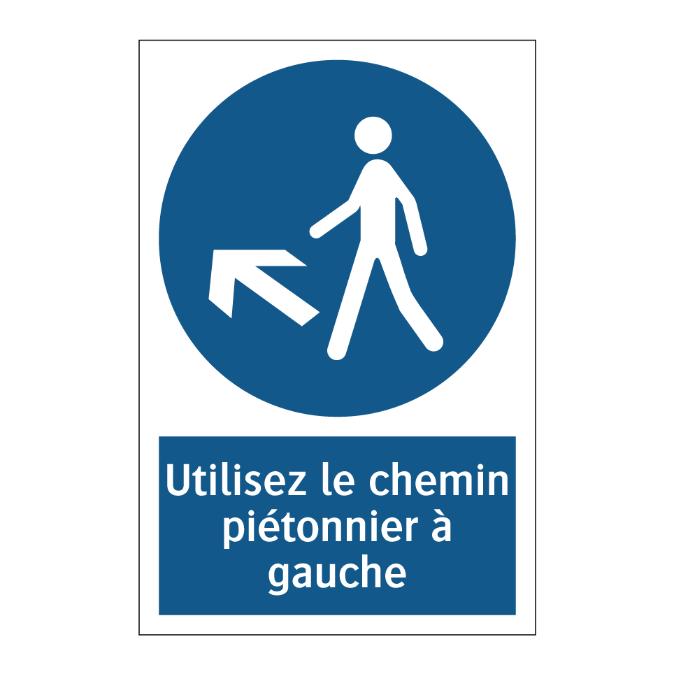 Ce panneau d'obligation est essentiel pour garantir la sécurité des piétons en dirigeant le flux de marche vers la gauche. Idéal pour les zones à fort trafic piétonnier, il peut être installé dans des environnements tels que les centres commerciaux, les parcs, ou les campus universitaires. En guidant les piétons de manière claire et concise, ce panneau contribue à éviter les collisions et à maintenir un flux ordonné. Sa couleur bleue et son texte blanc assurent une visibilité optimale, même de loin. Utilisez ce panneau pour renforcer la sécurité et l'organisation dans les espaces publics ou privés.