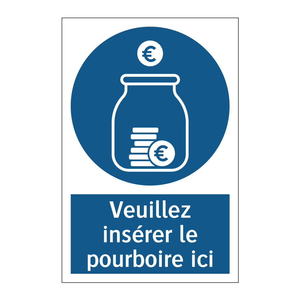 Ce panneau d'obligation est essentiel pour orienter vos clients de manière claire et efficace. Idéal pour les restaurants, cafés ou bars, il indique l'endroit précis où les pourboires doivent être déposés, facilitant ainsi le processus pour vos clients et votre personnel. Grâce à sa conception simple et son message explicite, ce panneau peut être placé à proximité de la caisse, sur le comptoir ou à l'entrée de votre établissement. En utilisant ce panneau, vous assurez une communication fluide et professionnelle, tout en améliorant l'expérience client. Sa visibilité et son design intuitif en font un outil indispensable pour tout espace accueillant du public.