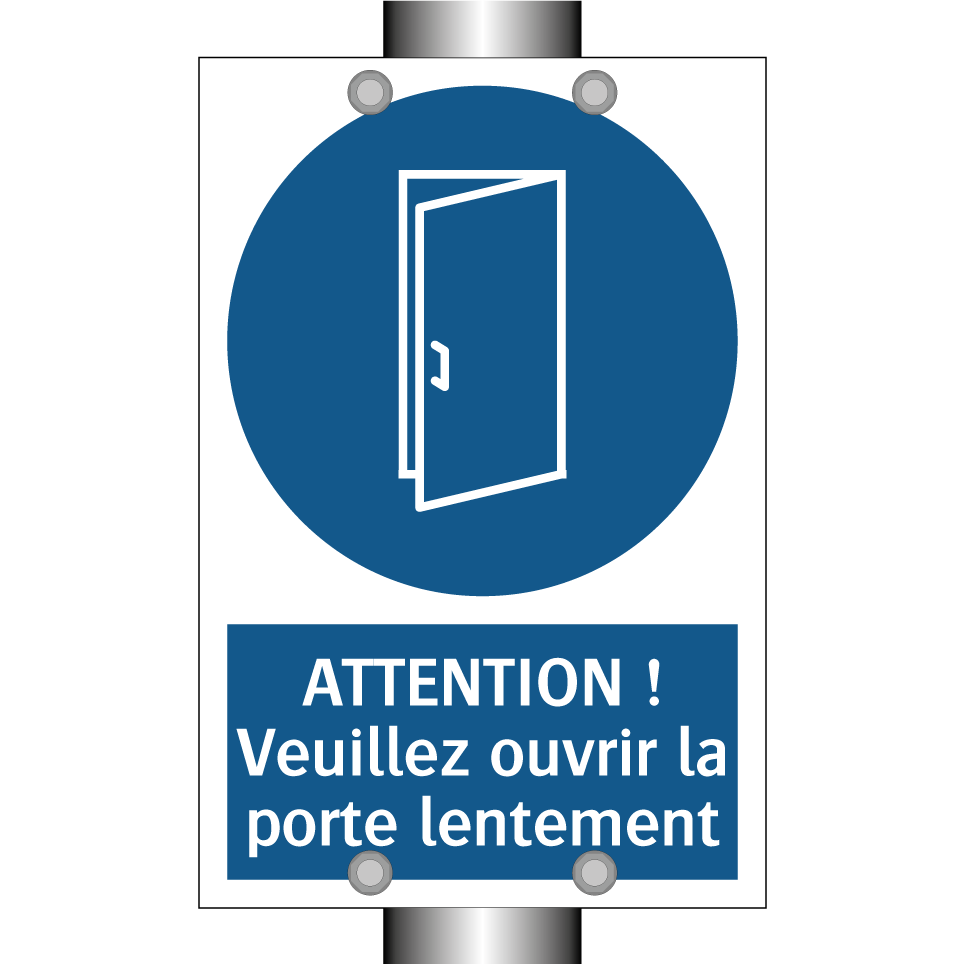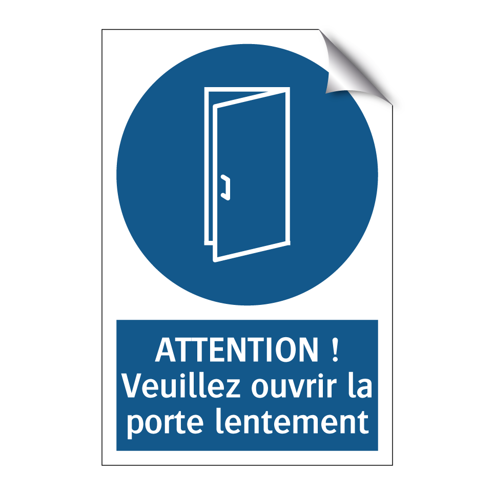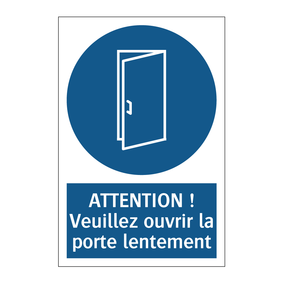 Panneau d'obligation avec le texte : "ATTENTION ! Veuillez ouvrir la porte lentement."