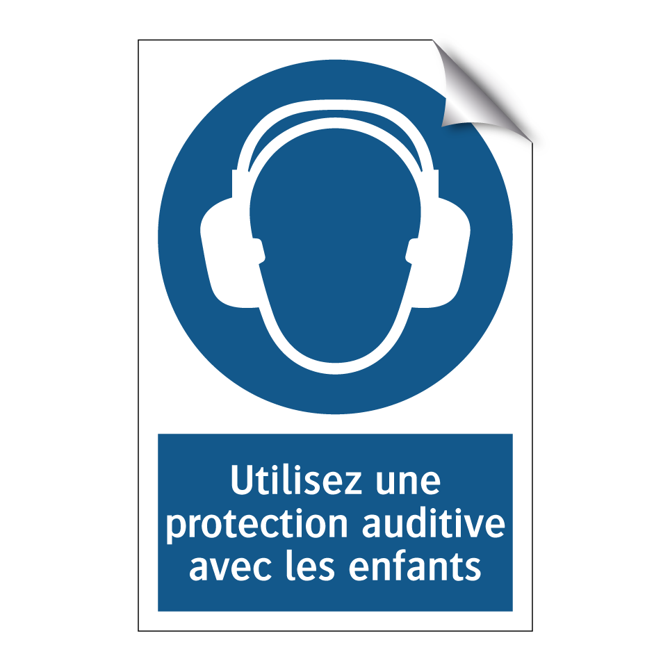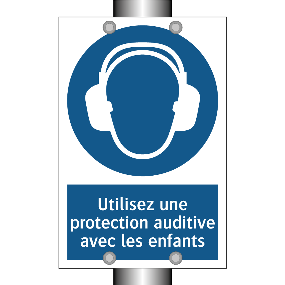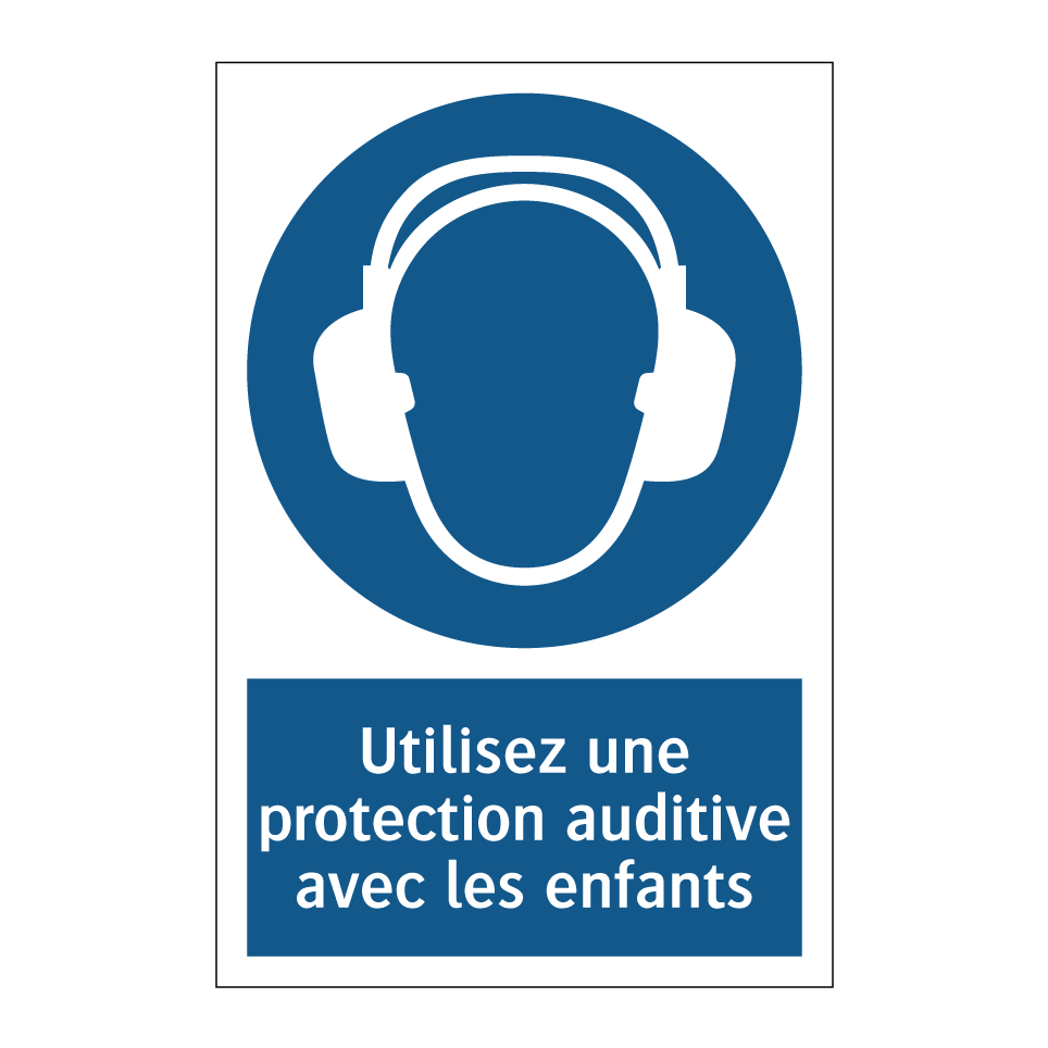 Panneau d'obligation avec le texte : "Utilisez une protection auditive avec les enfants"