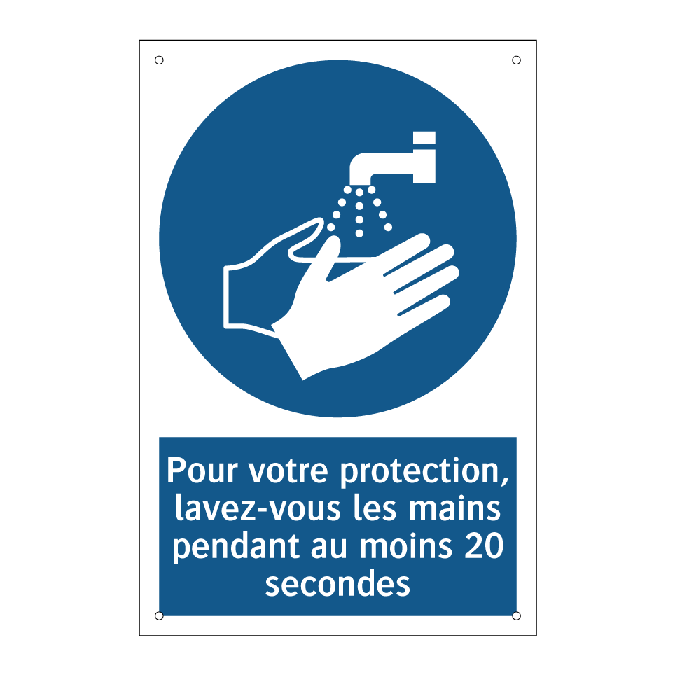 Panneau d'obligation avec le texte : "Pour votre protection, lavez-vous les mains pendant au moins 20 secondes"
