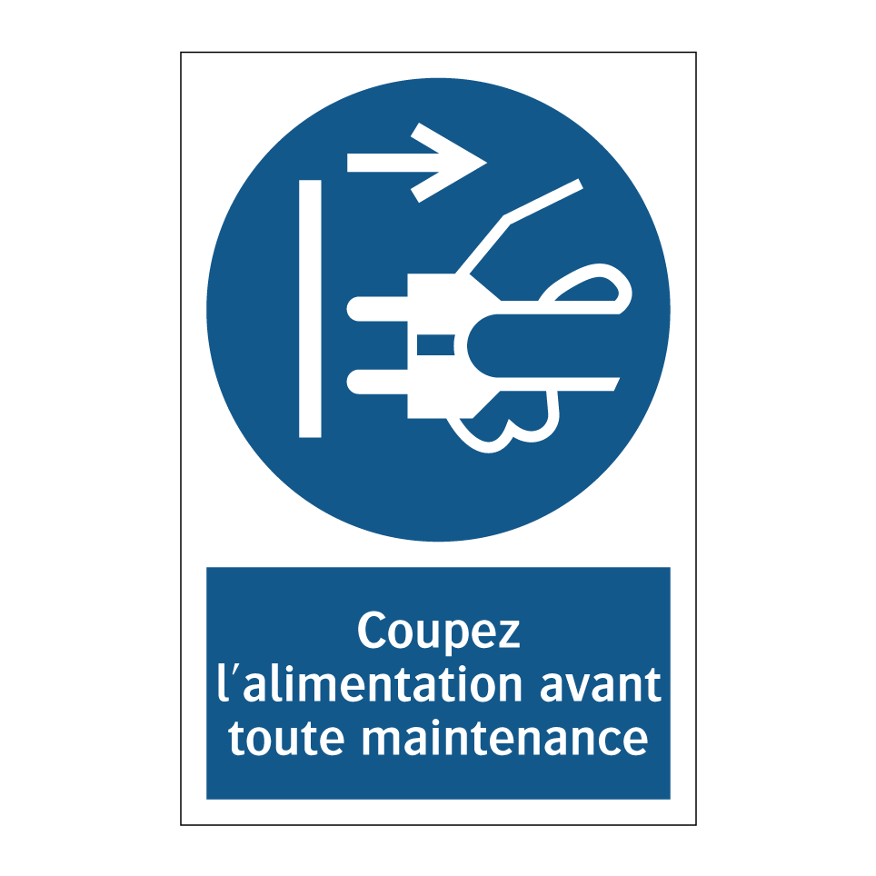 Panneau d'obligation avec le texte : "Coupez l'alimentation avant toute maintenance"