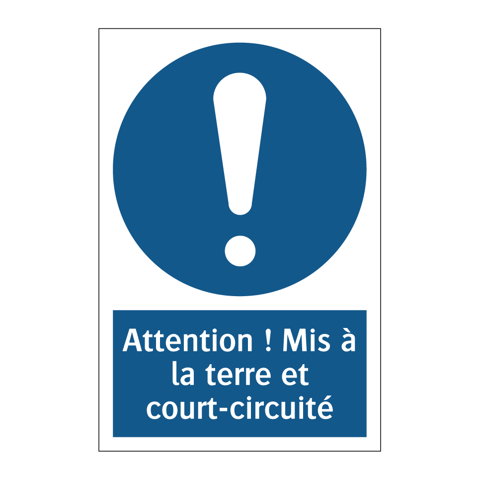 Panneau d'obligation avec le texte : "Attention ! Mis à la terre et court-circuité"