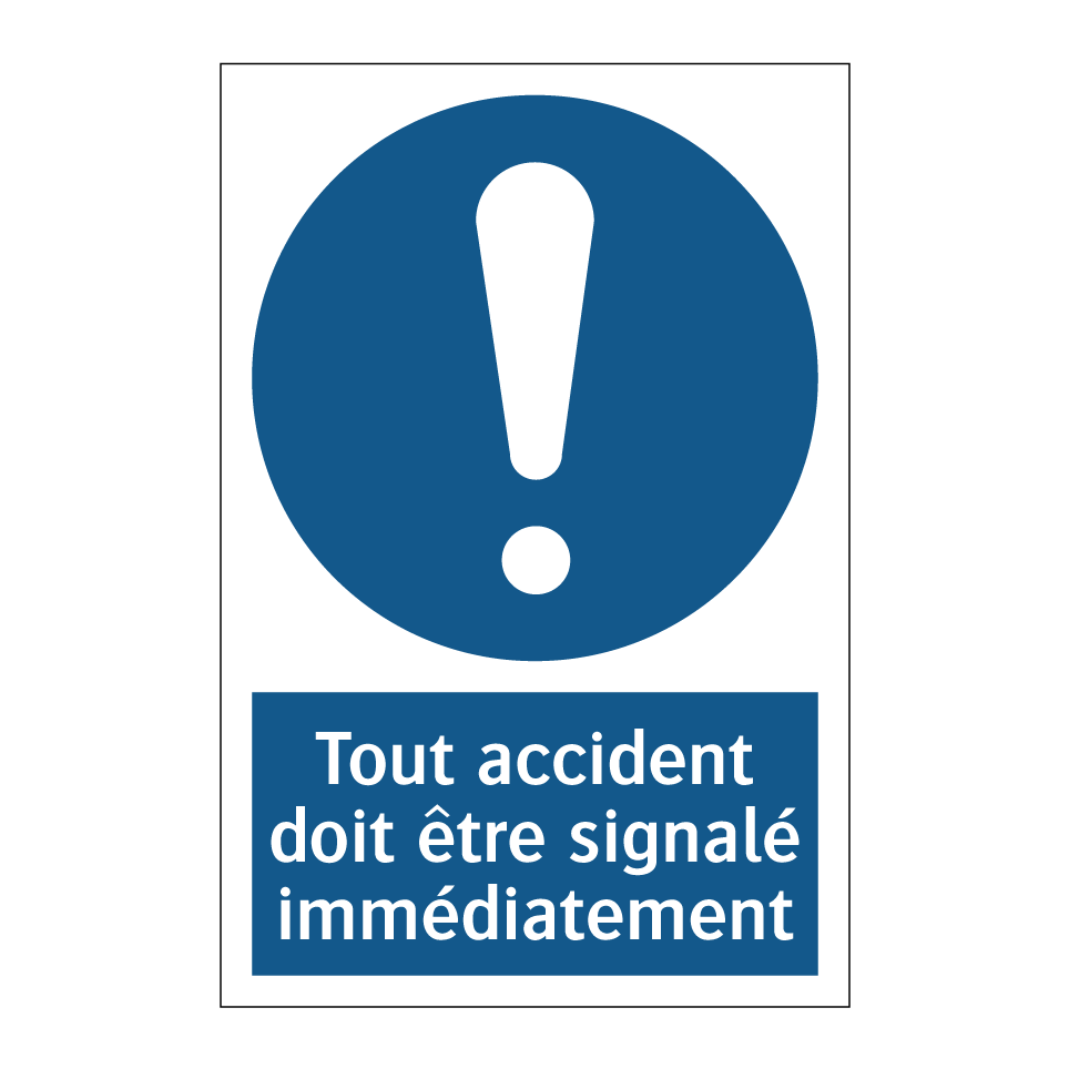 Panneau d'obligation avec le texte : "Tout accident doit être signalé immédiatement"
