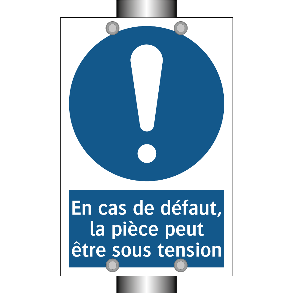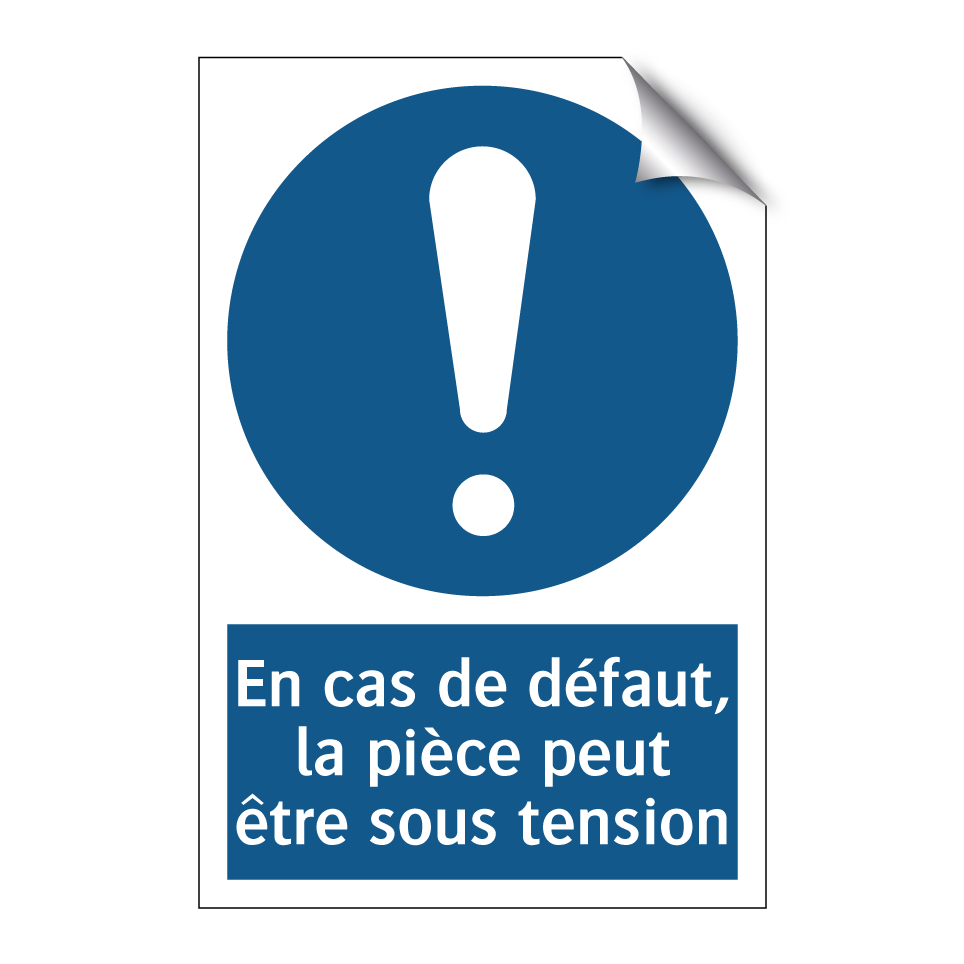 Panneau d'obligation avec le texte : "En cas de défaut, la pièce peut être sous tension"