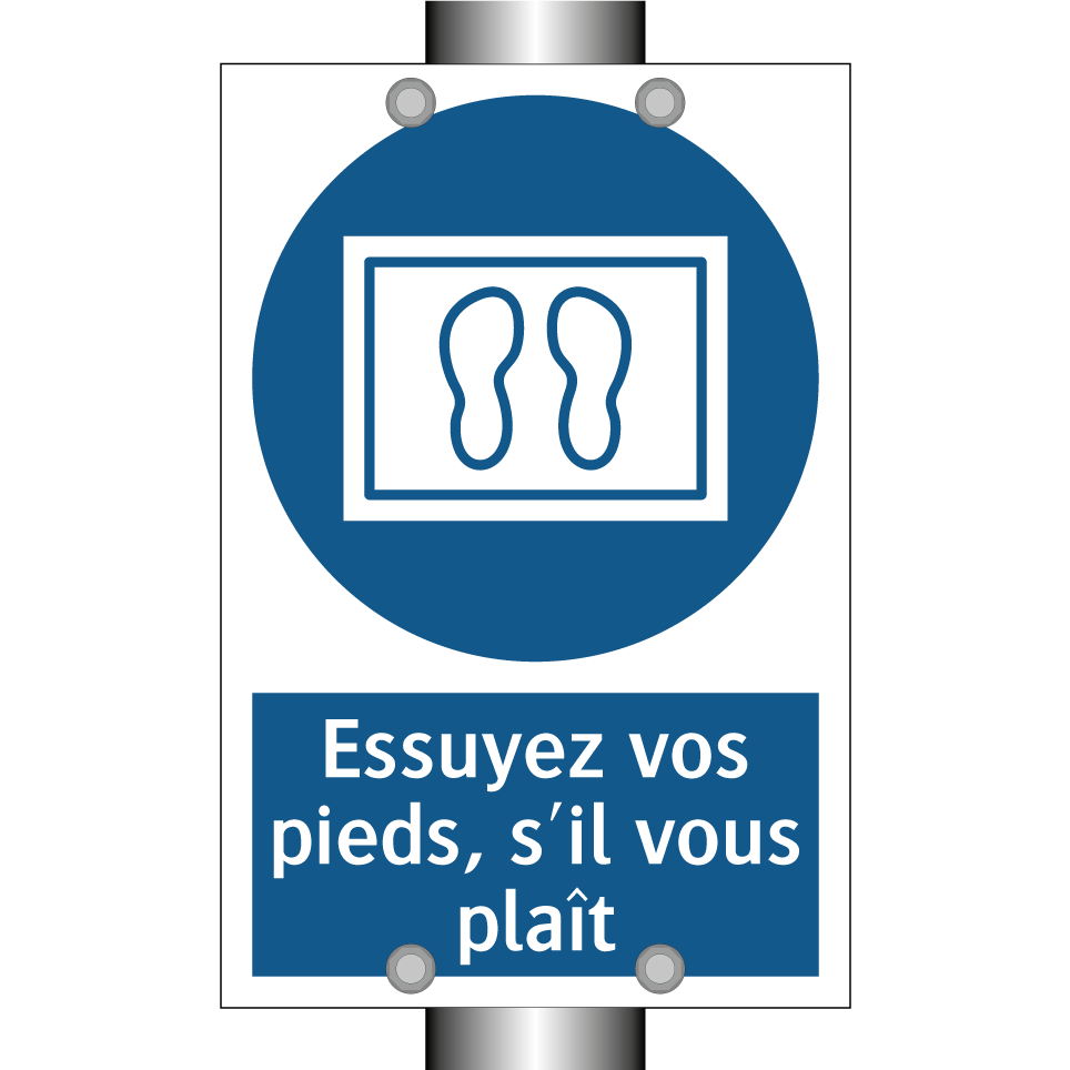 Panneau d'obligation avec le texte : "Essuyez vos pieds, s'il vous plaît"