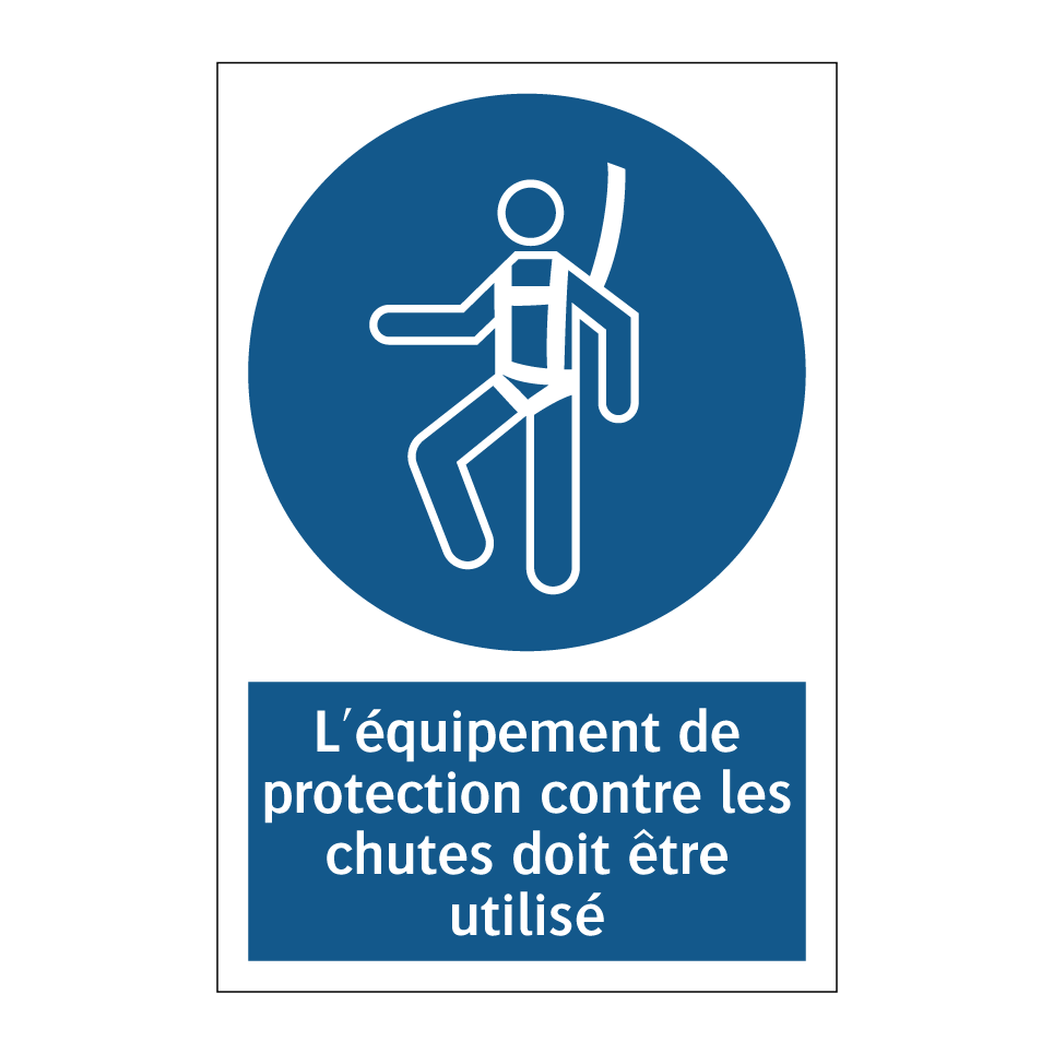 Panneau d'obligation avec le texte : "L'équipement de protection contre les chutes doit être utilisé"