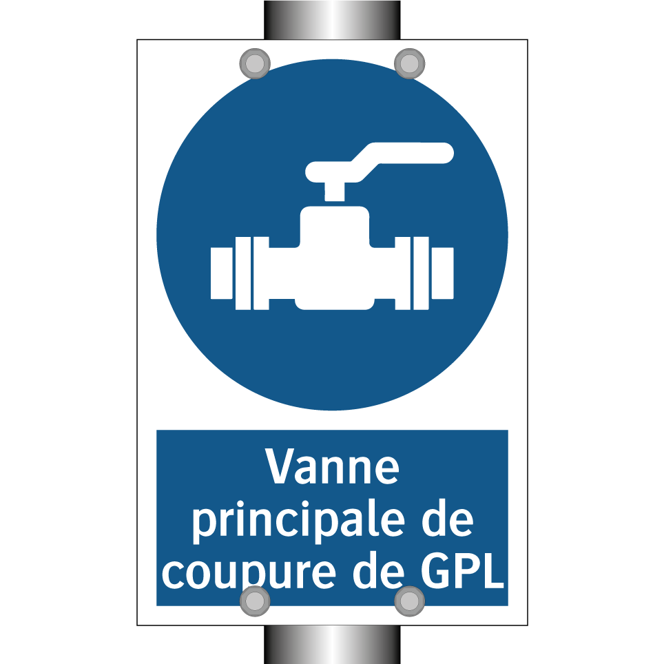 Panneau d'obligation avec le texte : "Vanne principale de coupure de GPL"