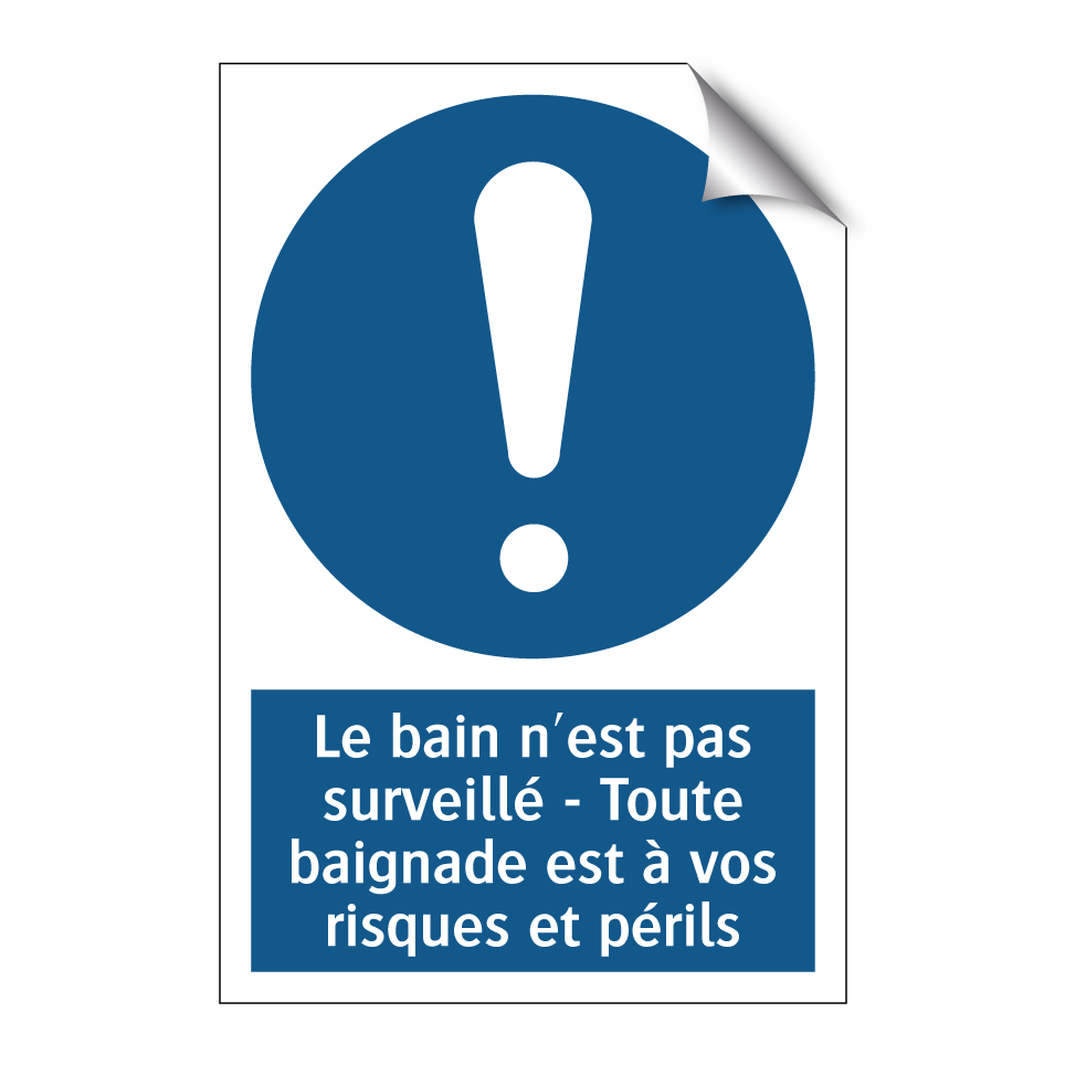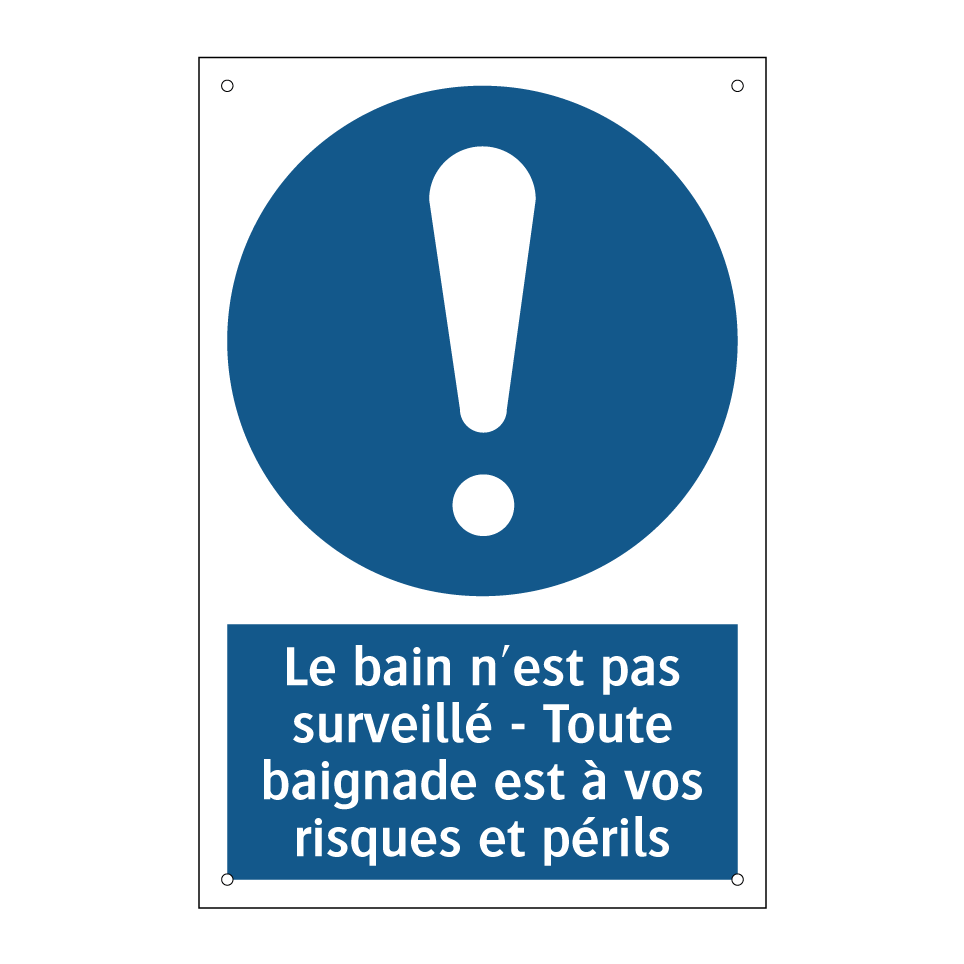 Panneau d'obligation avec le texte : "Le bain n'est pas surveillé - Toute baignade est à vos risques et périls"