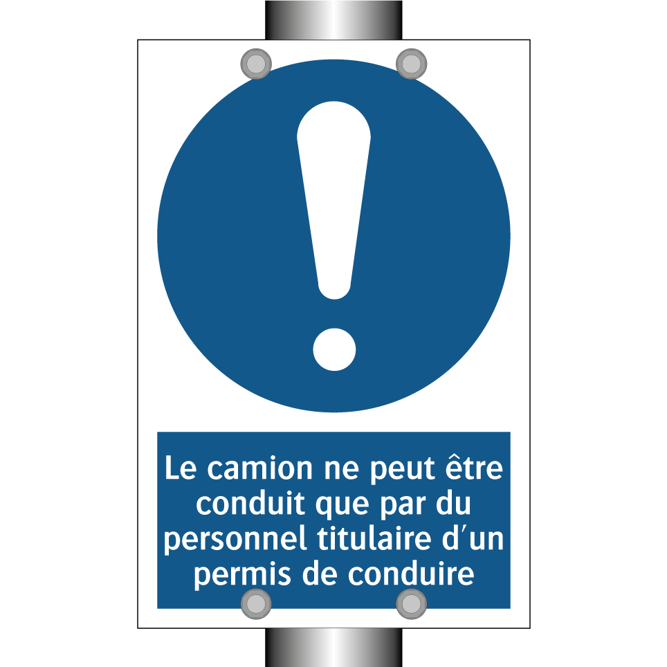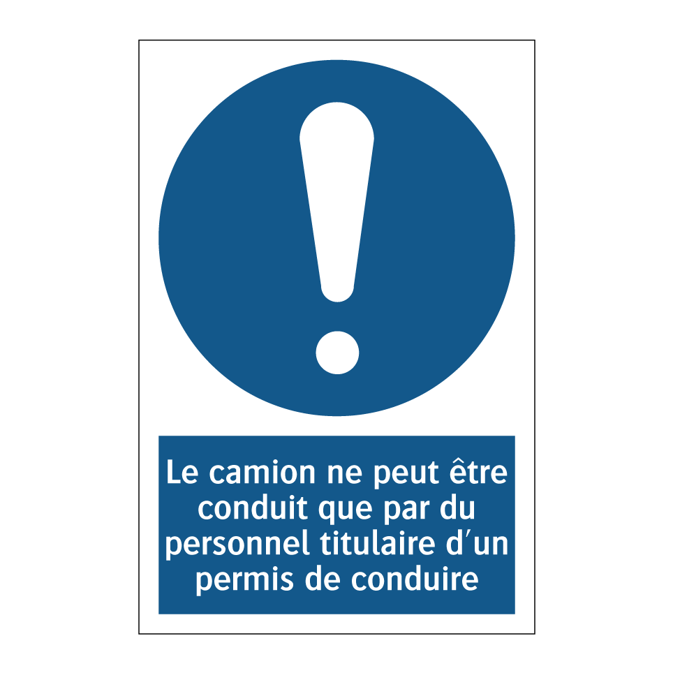 Panneau d'obligation avec le texte : "Le camion ne peut être conduit que par du personnel titulaire d'un permis de conduire."