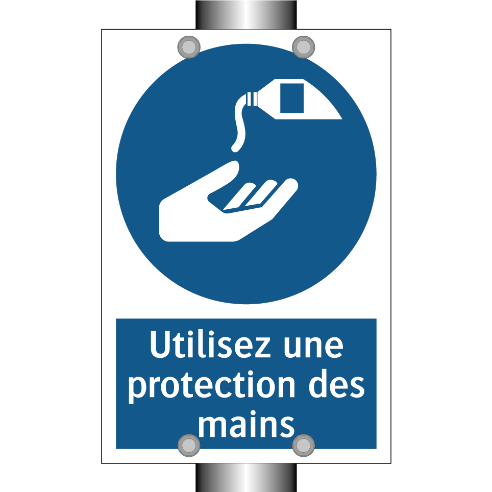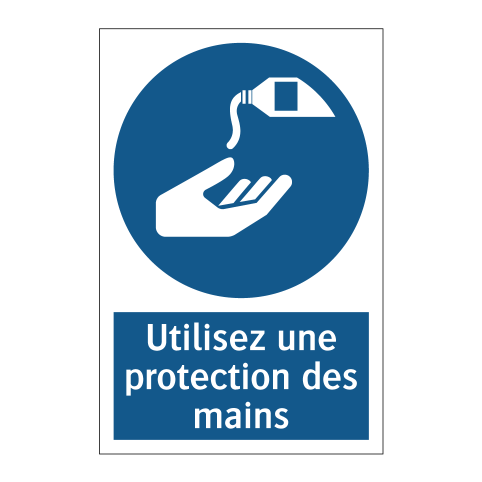 Panneau d'obligation avec le texte : "Utilisez une protection des mains"