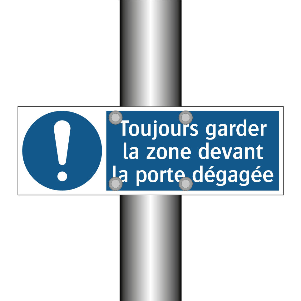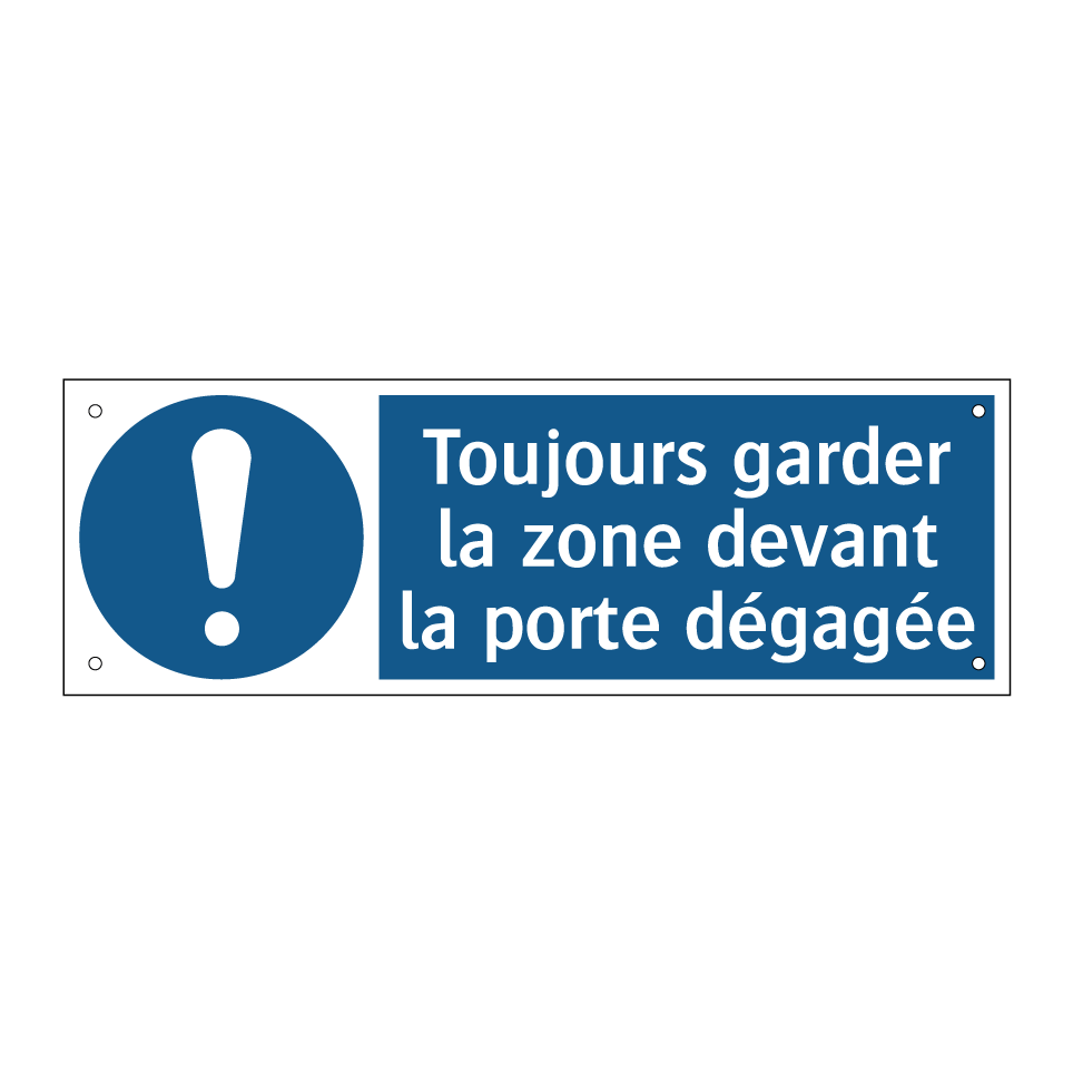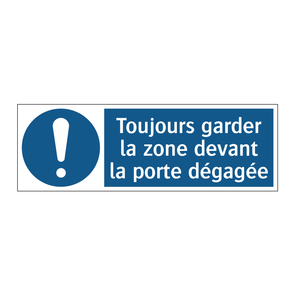 Panneau d'obligation avec le texte : "Toujours garder la zone devant la porte dégagée"