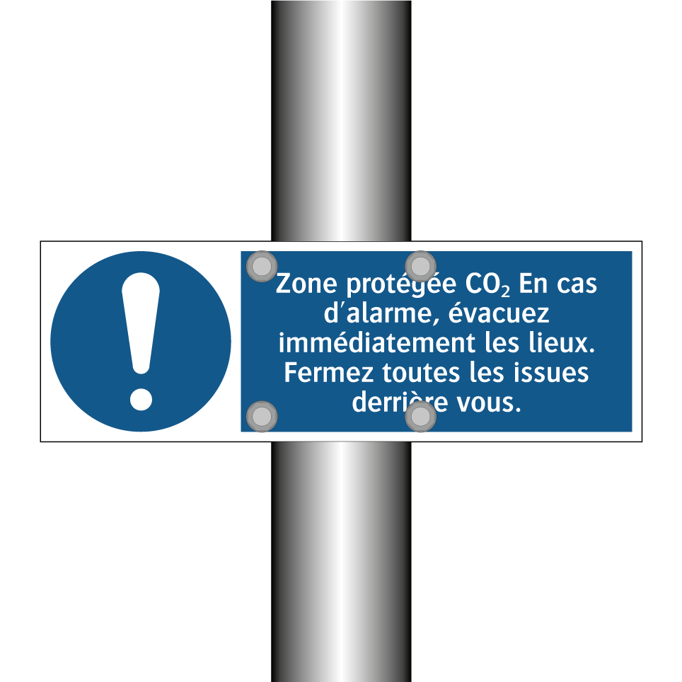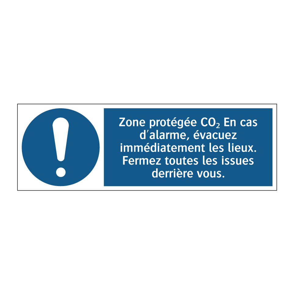 Panneau d'obligation avec le texte : "Zone protégée CO₂ En cas d'alarme, évacuez immédiatement les lieux. Fermez toutes les issues derrière vous."