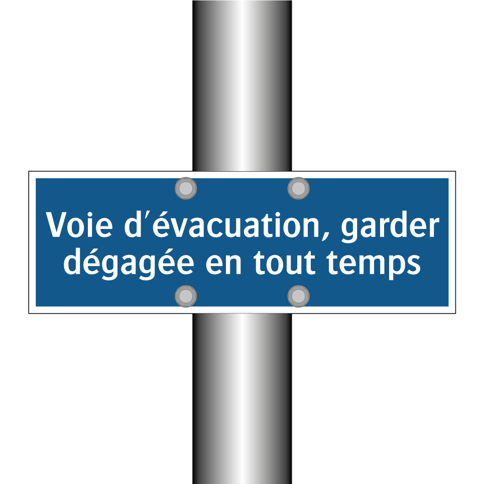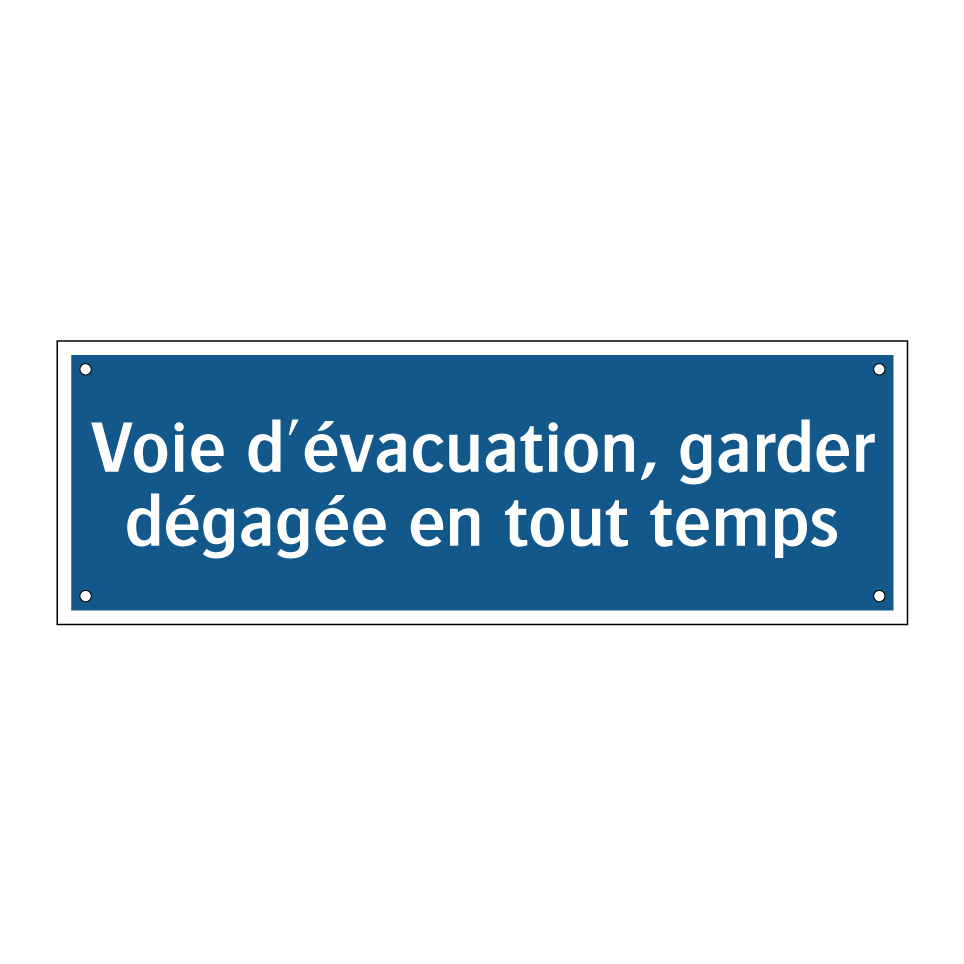 Panneau d'obligation avec le texte : "Voie d'évacuation, garder dégagée en tout temps"